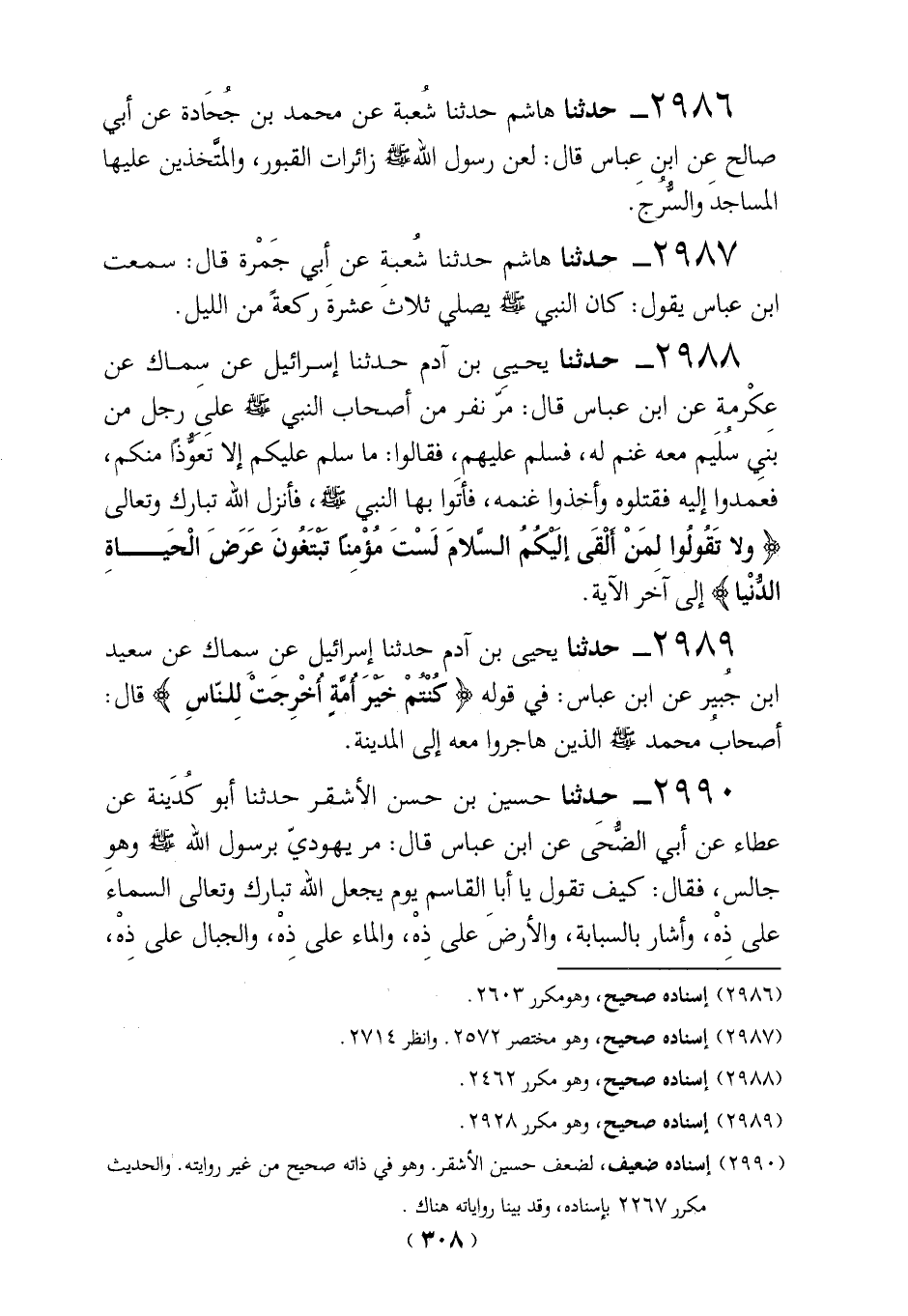 2989 - حدثنا يحيى بن آدم حدثنا إسرائيل عنِ سِماك عن سعيد ابن جُبير عن ابن عباس: في قوله {كُنْتُمْ خَيْرَ أُمَّةٍ أُخْرِجَتْ لِلنَّاسِ} قال: أصحابُ محمد - صلى الله عليه وسلم - الذين هاجروا معه إلى المدينة.