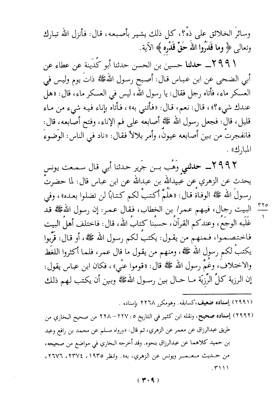 2992 - حدثني وَهْب بن جَرير حدثنا أبي قال سمعت يونس يحدث عن الزهري عن عُبيد الله بن عبد الله عن ابن عباس قال: لما حضرت رسولَ الله - صلى الله عليه وسلم - الوفاةُ قال: "هَلُمَّ أكتبْ لكم كتاباً لن تضلوا بعده"، وفي البيت رجال، فيهم عمر/ بن الخطاب، فقال عمر: إن رسول الله-صلي الله عليه وسلم- قد غَلَبه الوجَعُ، وعندكم القرآنُ، حسبُنا كتابُ الله، قال: فاختلف أهلُ البيت فاختصموا، فمنهم من يقول: يكتبُ لكم رسول الله - صلى الله عليه وسلم -، أو قال: قَرَّبوا يكتبْ لكمِ رسول الله - صلى الله عليه وسلم -، ومنهم من يقول ما قال عمر، فلما أكثروا اللغط والاختلاف، وغُمَّ رسول الله-صلي الله عليه وسلم- قال: "قوموا عنِّي"، فكان ابن عباس يقول: