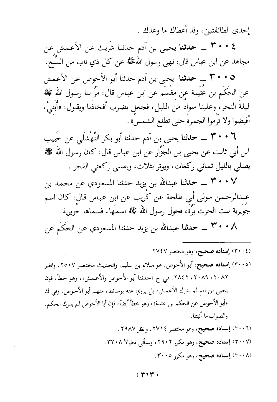 (3005) إسناده صحيح، أبو الأحوص. هو سلام بن سليم. والحديث مختصر 2507 وانظر 2082، 2089، 2842. في ح "حدثنا أبو الأحوص والأعمش"، وهو خطأ، فإن يحيى بن آدم لم يدرك الأعمش، بل يروي عنه بوسائط، منهم أبو الأحوص. وفي ك "أبو الأحوص عن الحكم بن عتيبة"، وهو خطأ أيضاً، فإن أبا الأحوص لم يدرك الحكم.