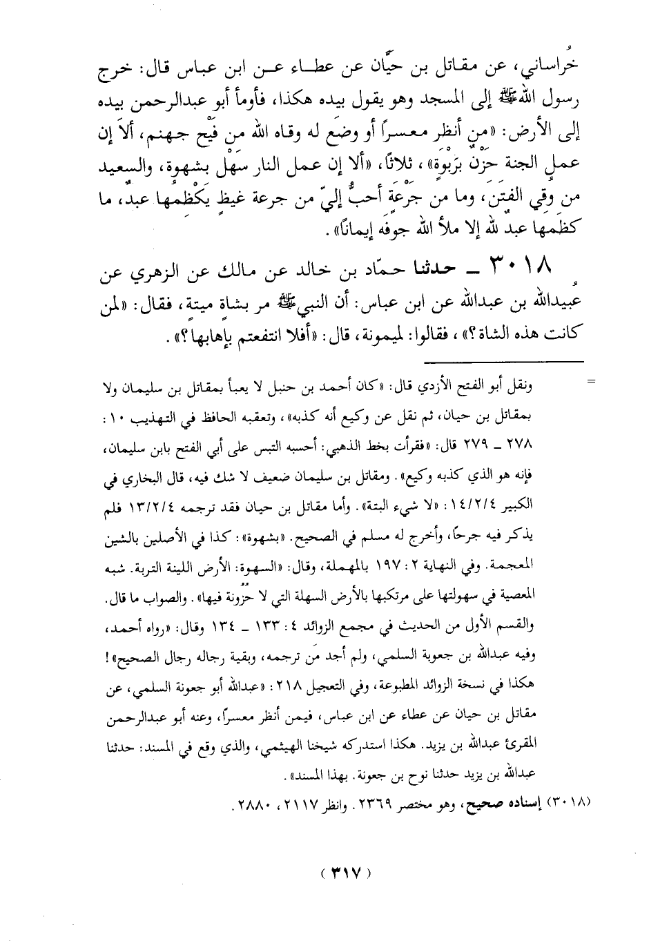 خُراساني، عن مقاتل بن حيَّان عن عطاء عن ابن عباس قال: خرج رسول الله - صلى الله عليه وسلم - إلى المسجد وهو يقول بيده هكذا، فأومأ أبو عبد الرحمن بيده إلى الأرض: "مِن أنظِر معسراً أو وضَع له وقاه الله من فَيْح جهنم، ألاَ إن عمل الجنة حزْنٌ برَبْوةٍ"، ثلاثاً، "ألا إن عمل النار سَهْل بشهوة، والسعيد من وُقى الفتَنَ، وما من جَرْعَةٍ أحبُّ إلى من جرعة غيظ يَكْظمُها عبدٌ، ما كظَمَها عبدٌ لله إلا ملأ الله جوفَه إيماناً".