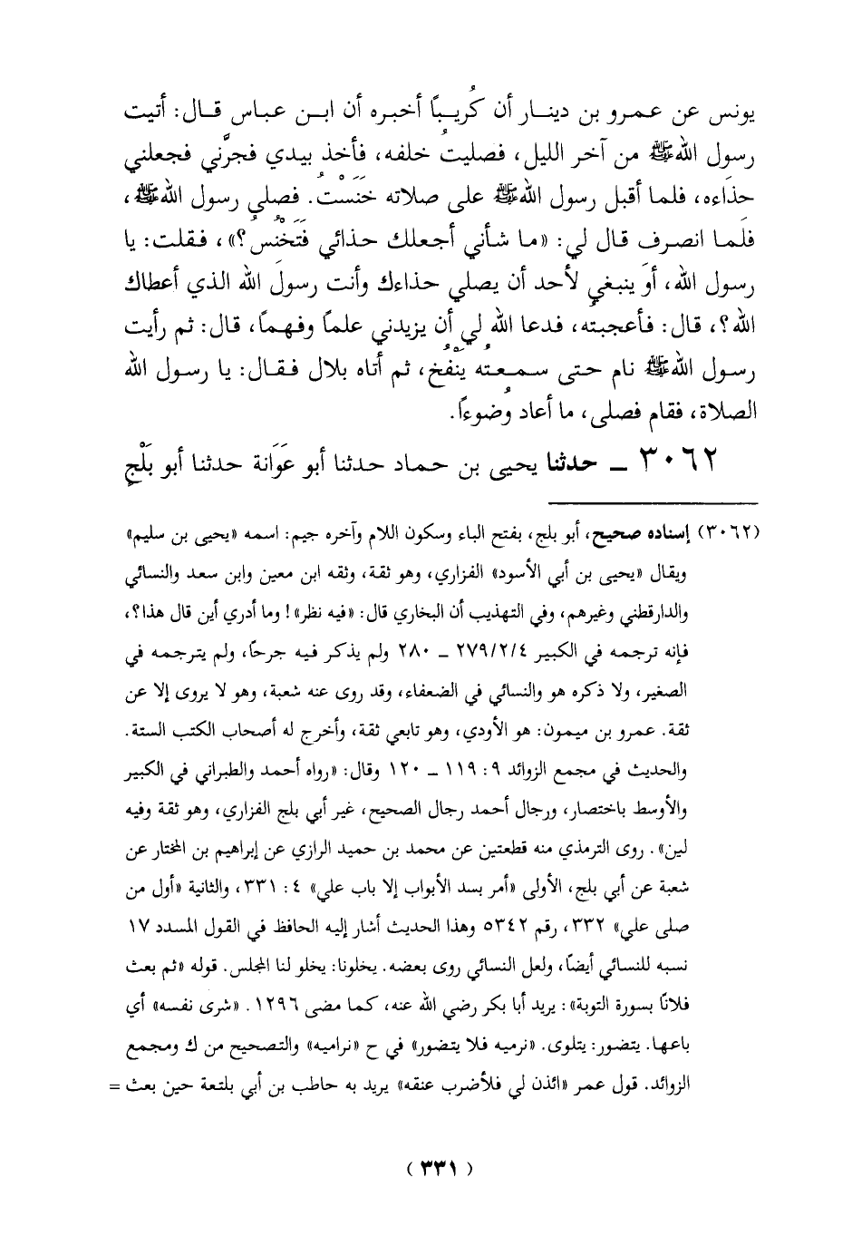 يونس عن عمرو بن دينارأن كُريباً أخبره أن ابن عباس قال: أتيت رسول الله - صلى الله عليه وسلم - من آخر الليل، فصليتُ خلفه، فِأخذ بيدي فجرَّني فجعلني حذَاءه، فلما أقبل رسول الله - صلى الله عليه وسلم - على صلاته خنَسْتُ. فصلى رسول الله-صلي الله عليه وسلم-، فلَما انصرف قال لي: "ما شأني أجعلك حذائي فَتَخْنُس؟ "، فقلت: يا رسول الله، أوَ ينبغي لأحد أن يصلي حذاءك وأنت رسولَ الله الذي أعطاك الله؟، قال: فأعجبته، فدعا الله لي أن يزيدني علماً وفهماً، قال: ثم رأيت رسول الله -صلي الله عليه وسلم- نام حتى سمعته ينفُخ، ثم أتاه بلال فقال: يا رسول الله الصلاة، فقام فصلى، ما أعاد وُضوءاً.