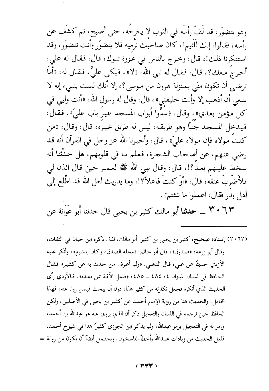 (3063) إسناده صحيح، كثير بن يحيى بن كثير أبو مالك: ثقة، ذكره ابن حبان في الثقات، وقال أبو زرعة: "صدوق"، قال أبو حاتم: "محله الصدق، وكان يتشيع"، وأنكر عليه الأزدي حديثاً عن علي، قال الذهبي: "ولم أعرف من حدث به عن كثير" فقال الحافظ في لسان الميزان 4: 484 - 485: "فلعل الآفة ممن بعده". فالأزدي رأى الحديث الذي أنكره فجعل نكارته من كثير هذا، دون أن يبحث فيمن رواه عنه، فهذا تحامل. والحديث هنا من رواية الإمام أحمد عن كثير بن يحيى في الأصلين، ولكن الحافظ حين ترجمه في اللسان والتعجيل ذكر أن الذي يروي عنه هو عبد الله بن أحمد، ورمز له في التعجيل برمز عبد الله، ولم يذكر ابن الجوزي كثيراً هذا في شيوخ أحمد.