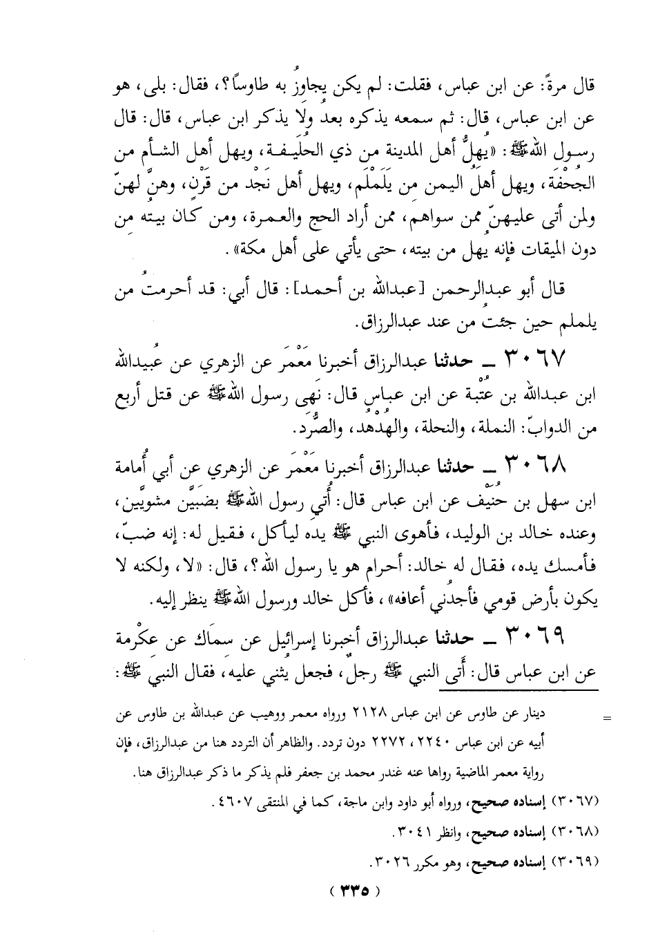 = دينار عن طاوس عن ابن عباس 2128 ورواه معمر ووهيب عن عبد الله بن طاوس عن أبيه عن ابن عباس 2240، 2272 دون تردد. والظاهر أن التردد هنا من عبد الرزاق، فإن رواية معمر الماضية رواها عنه غندر محمد بن جعفر فلم يذكر ما ذكر عبد الرزاق هنا. (3067) إسناده صحيح، ورواه أبو داود وابن ماجة، كما في المنتقى 4607.