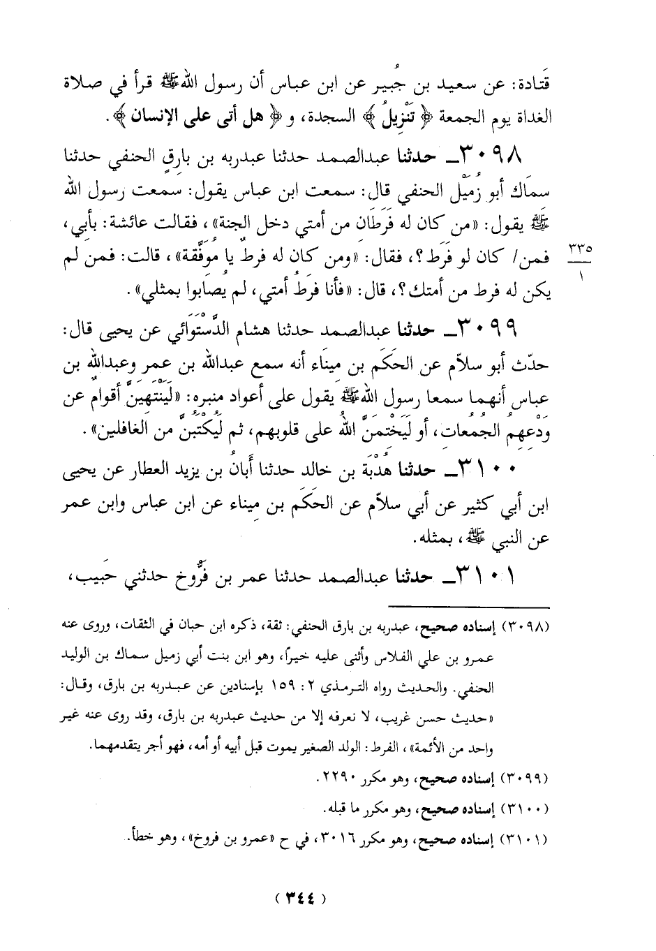 3098 - حدثنا عبد الصمد حدثنا عبد ربه بن بارِقٍ الحنفي حدثنا سمَاك أبو زُمَيْل الحنفي قال،: سمعت ابن عباس يقول: سَمعت رسول الله - صلى الله عليه وسلم - يقول: "منَ كان له فَرَطَان من أمتي دخل الجنة"، فقالت عائشة: بأبِي، فمن كان لو فَرَط؟، فقال: َ "ومن كان له فرطٌ يا مُوَفَّقة"، قالت: فمن لم يكن له فرط من أمتك؟، قال: "فأنا فرَطُ أمتي، لم يُصَابوا بمثلي".
