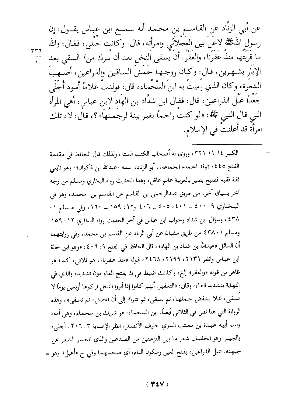 عن أبي الزنِّاد عنِ القاسمِ بن محمد أنه سمع ابن عباس يقول: إن رسول الله - صلى الله عليه وسلم - لاعِنَ بين العجْلاَنّي وامرأته، قال: وكانت حُبْلى، فقال: والله ما قَرَبْتُها منذُ عَفَرْنا، والعَفْرُ: أن يسقى اَلنخل بعد أن يُترك من السقي بعد الإبَارِ بشهرين، قال: وكان زوجها حَمْشَ الساقين والذراعين، أصهبَ الشعرة، وكان الذي رُميتْ به ابنَ السَّحْماء، قال: فولدتْ غلاماً أسود أَجْلَى جَعْداً عبل الذراعين، قال: فقال ابن شدَّاد بن الهَاد لابن عباسٍ: أهى المرأة التي قال النبي-صلي الله عليه وسلم-: "لو كنتُ راجماً بغير بينة لرجَمتُهَا"؟، قال: لا، تلك امرأة قد أعلنتْ في الإسلام.
