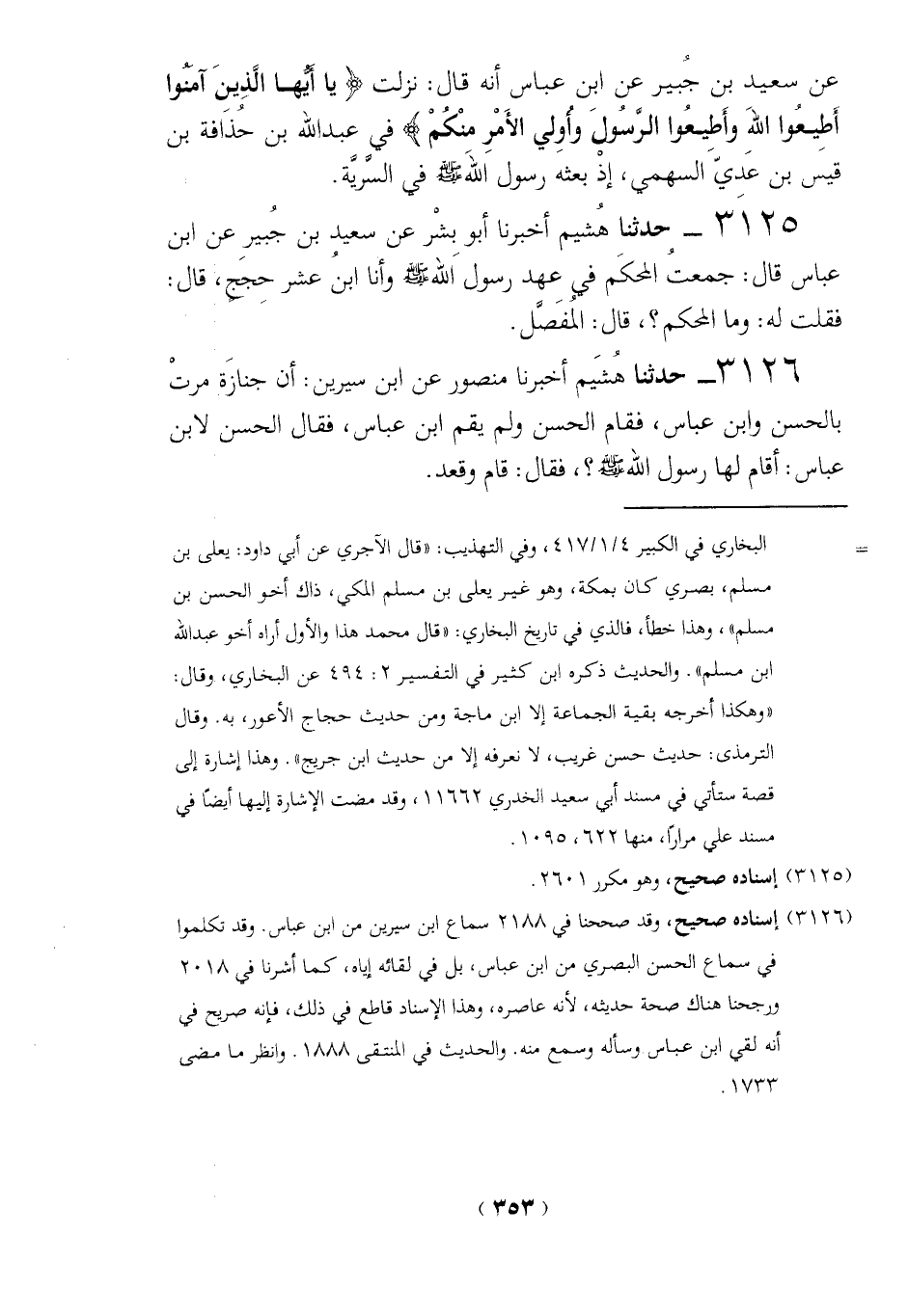 (3126) إسناده صحيح، وقد صححنا في 2188 سماع ابن سيرين من ابن عباس. وقد تكلموا في سماع الحسن البصري من ابن عباس، بل في لقائه إياه، كما أشرنا في 2018 ورجحنا هناك صحة حديثه، لأنه عاصره, وهذا الإسناد قاطع في ذلك، فإنه صريح في أنه لقى ابن عباس وسأله وسمع منه. والحديث في المنتقى 1888. وانظر ما مضى 1733.