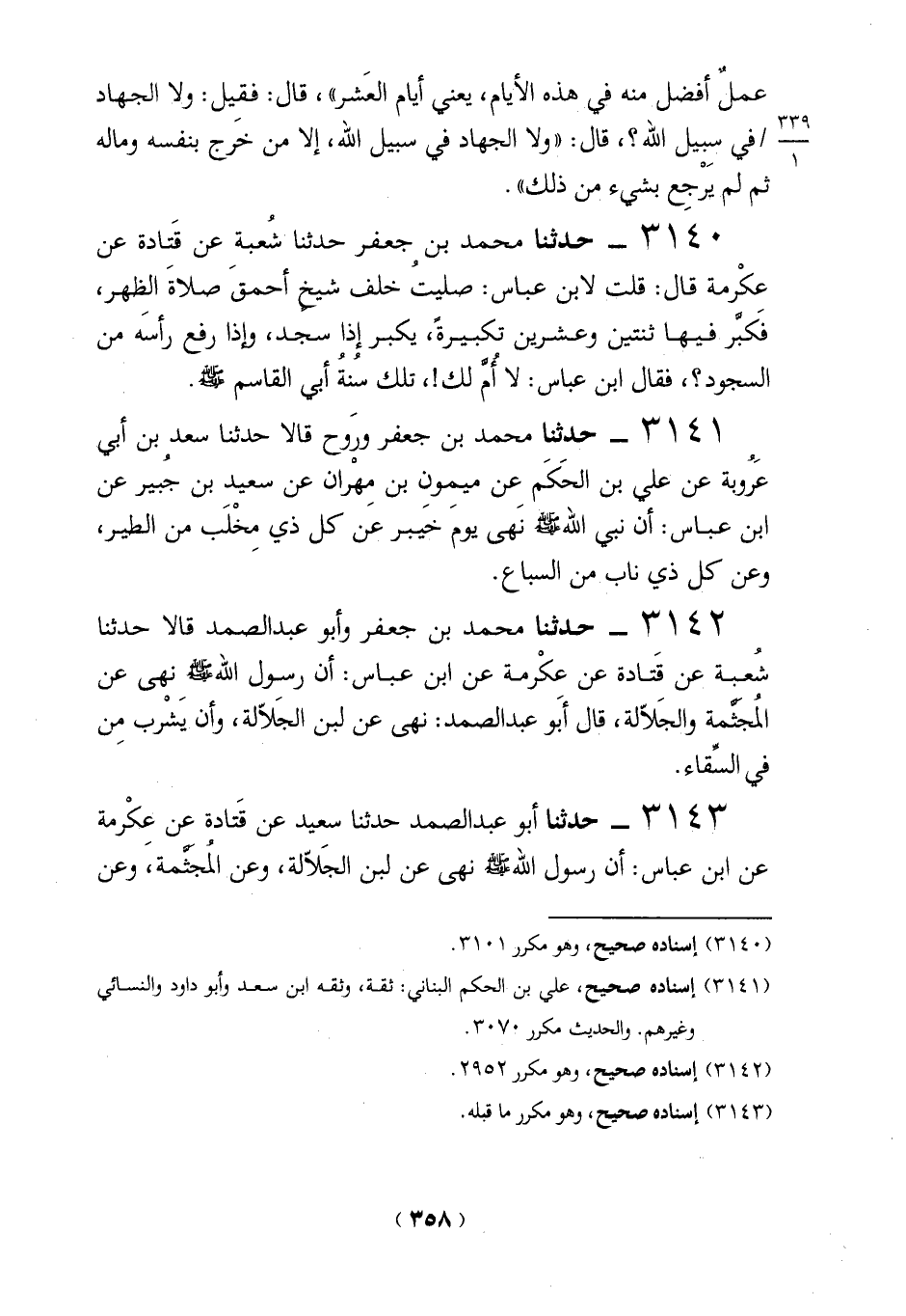 3140 - حدثنا محمد بن جعفر حدثنا شُعبة عن قَتادة عن عكْرمة قال: قلت لابن عباس: صليتُ خلف شيخ أحمقَ صلاةَ الظهر، فَكبَّر فيها ثنتين وعشرين تكبيرةً، يكبر إذا سجد، وإذا رفع رأسَه من