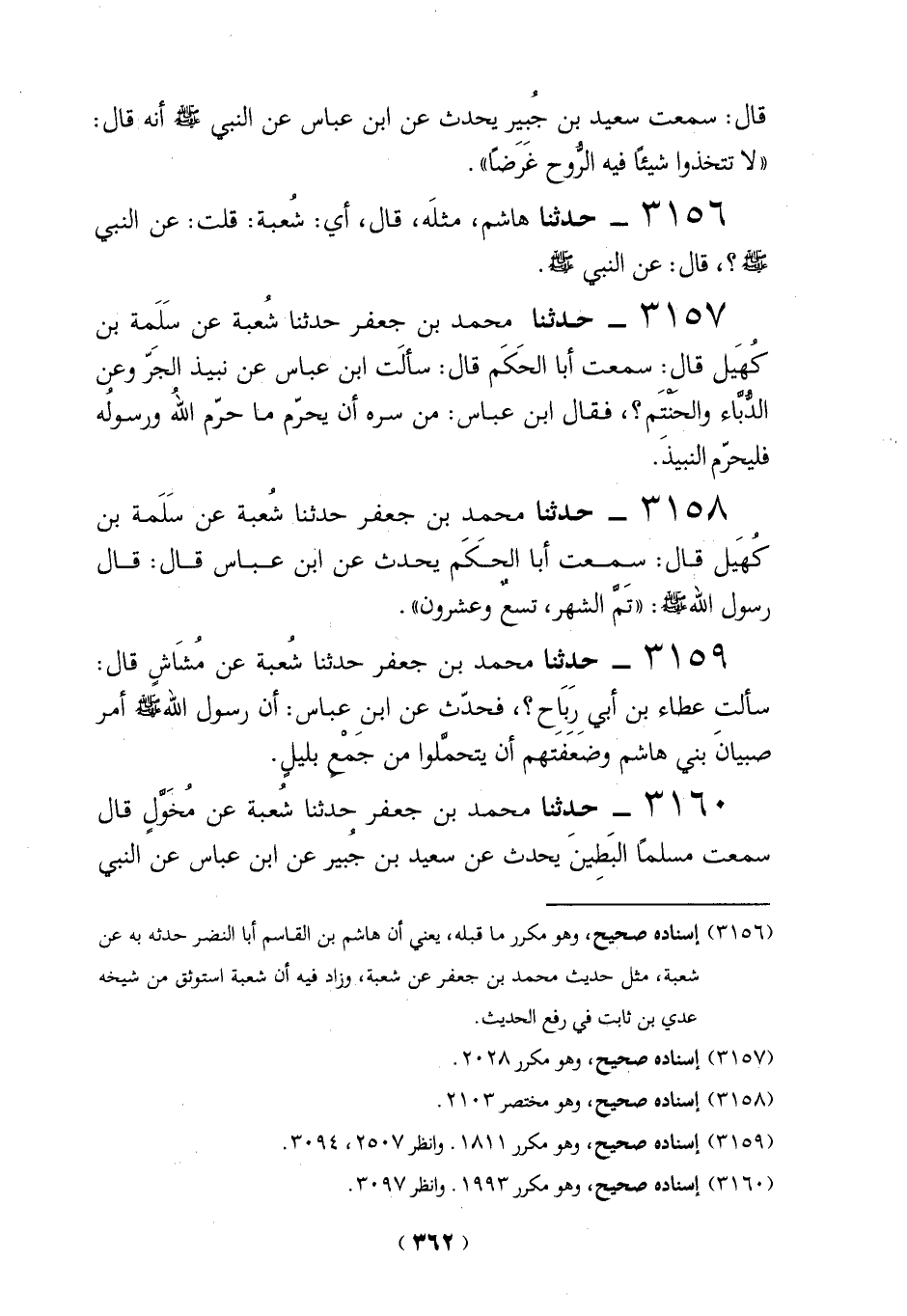 3157 - حدثنا محمد بن جعفرحدثنا شُعبة عن سَلَمة بن كُهَيل قال: سمعت أبا الحَكَم قال: سألَت ابن عباس عن نبيذ الجَرّ وعن الدُّبَّاء والحَنْتَم؟، فقال ابن عباس: من سره أن يحرّم ما حرّم الله ورسولُه فليحرّم النبيذَ.