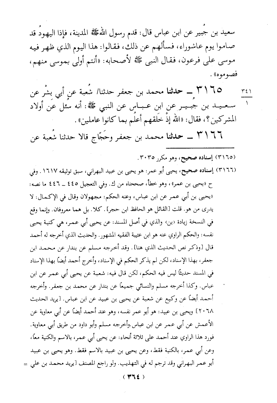 جعفر، بهذا الإسناد، لكن لم يذكر الحكم في الإسناد، وأخرج أحمد أيضاً بهذا الإسناد في المسند حديثاً ليس فيه الحكم، لكن قال فيه: شعبة عن يحيى أبي عمر عن ابن عباس. وكذا أخرجه مسلم والنسائي جميعاً عن بندار عن محمد بن جعفر. وأخرجه أحمد أيضاً عن وكيع عن شعبة عن يحيى بن عبيد عن ابن عباس. [يريد الحديث 2068] ويحيى بن عبيد: هو أبو عمر نفسه، وهو عند أحمد أيضاً عن أبي معاوية عن الأعمش عن أبي عمر عن ابن عباس. وأخرجه مسلم وأبو داود من طريق أبي معاويهَ.