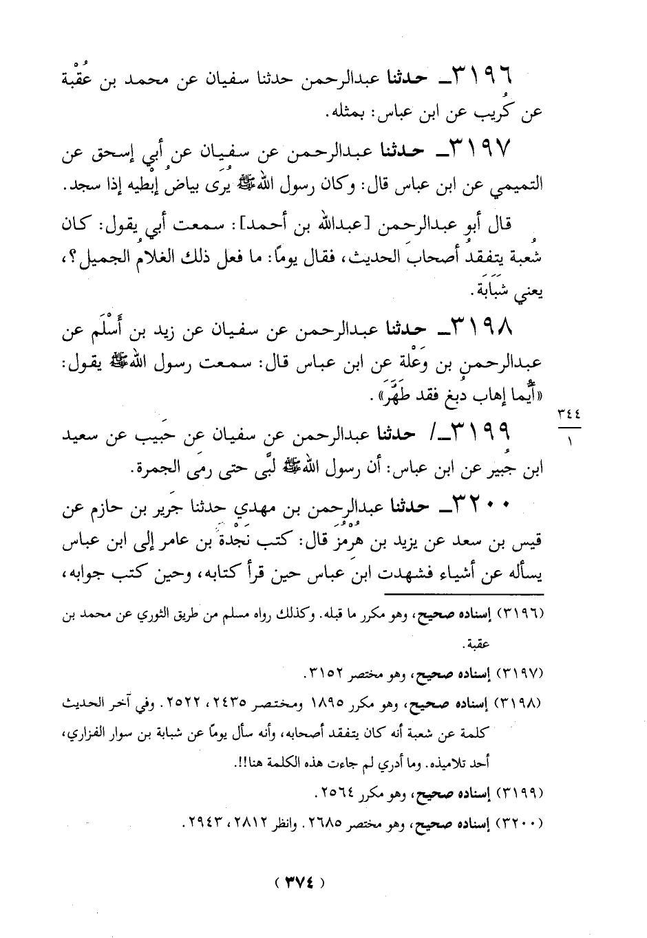 (3198) إسناده صحيح، وهو مكرر 1895ومختصر 2435، 2522. وفي آخرالحديث كلمة عن شعبة أنه كان يتفقد أصحابه، وأنه سأل يوماً عن شبابة بن سوار الفزاري، أحد تلاميذه. وما أدري لم جاءت هذه الكلمة هنا!!.