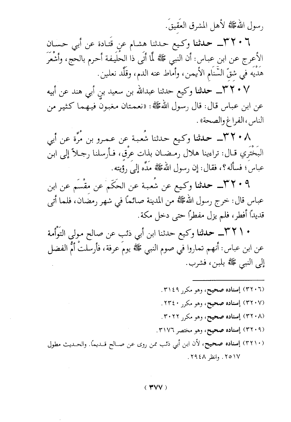 3210 - حدثنا وكيع حدثنا ابن أبي ذئب عن صالح مولى التَوْأمة عن ابن عباس: أنهم تماروا في صوم النبي - صلى الله عليه وسلم - يومَ عرفة، فأرسلتْ أمُّ الفضل إلى النبي - صلى الله عليه وسلم - بلبن، فشرب.