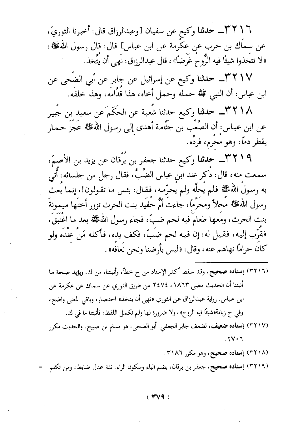3216 - حدثنا وكيع عن سفيان [وعبد الرزاق قال: أخبرنا الثوريّ، عن سمَاك بن حرب في عِكْرمة عن ابن عباس] قال: قال رسول الله - صلى الله عليه وسلم -: "إلا تتخَذوا شيئاً فيه الرُّوح غَرضاً"، قال عبد الرزاق: نَهى أن يُتَّخذ.