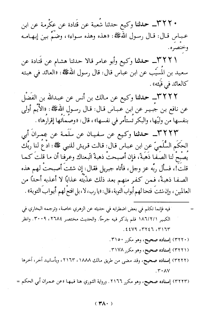 3221 - حدثنا وكيع وأبو عامر قالا حدثنا هشام عن قَتادة عن سعيد بن المُسَيَّب عن ابن عباس قال: قال رسول الله-صلي الله عليه وسلم-: "العائد في هبته كالعائد في قَيئه".