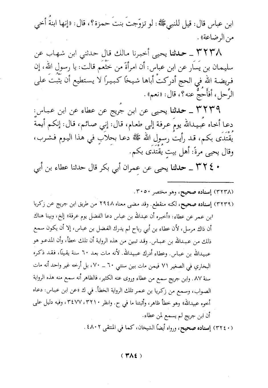(3239) إسناده صحيح، لكنه منقطع. وقد مضى معناه 2948 من طريق ابن جُريج عن زكريا بن عمر عن عطاء: "أخبره أن عبد الله بن عباس دعا الفضل يوم عرفة" إلخ، وبينا هناك أن ذاك مرسل، لأن عطاء بن أبي رباح لم يدرك الفضل بن عباس، إلا أن يكون سمع ذلك من عبد الله بن عباس. وقد تبين من هذه الرواية أن تلك خطأ، وأن المدعو هو عبيد الله بن عباس. وعطاء أدرك عبيد الله. لأنه مات بعد 60 سنة يقيناً، فقد ذكره البخاري في الصغير 71 فيمن مات بين سنتي 60 - 70، بل أرخه غير واحد أنه مات سنة 87. وابن جُريج سمع من عطاء وروى عنه الكثير، فالظاهر أنه سمع منه هذه الرواية الصواب، وسمع من زكريا بن عمر تلك الرواية الخطأ. في ك "عن ابن عباس: دعاه أخوه عبيد الله" وهو خطأ ظاهر، وأثبتنا ما في ح. وانظر 3210، 3477، وفيه دليل على أن ابن جُريج لم يسمع بن عطاء.