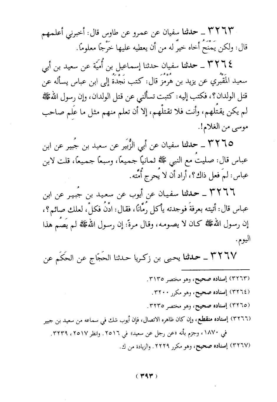 3264 - حدثنا سفيان حدثنا إسماعيل بن أُمَيّة عن سعيد بن أبي سعيد المَقْبُري عن يزيد بن هُرْمُزَ لحال: كتب نَجْدَةُ إلى ابن عباس يسأله عن قتل الولدان؟، فكتب إليه: كتبت تسألني عن قتل الولدان، وإن رسول الله -صلي الله عليه وسلم- لم يكن يقتُلهم، وأنت فلا تقتلْهم، إلا أن تعلم منهم مثل ما عَلم صاحب موسى من الغلام!.
