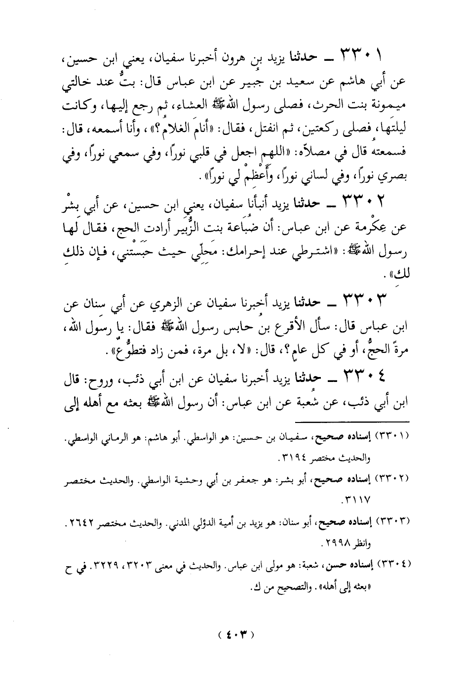 3304 - حدثنا يزيد أخبرنا سفيان عن ابن أبي ذئب، وروح: قال ابن أبي ذئب، عن شُعبة عن ابن عباس: أن رسول الله - صلى الله عليه وسلم - بعثه مع أهله إلى