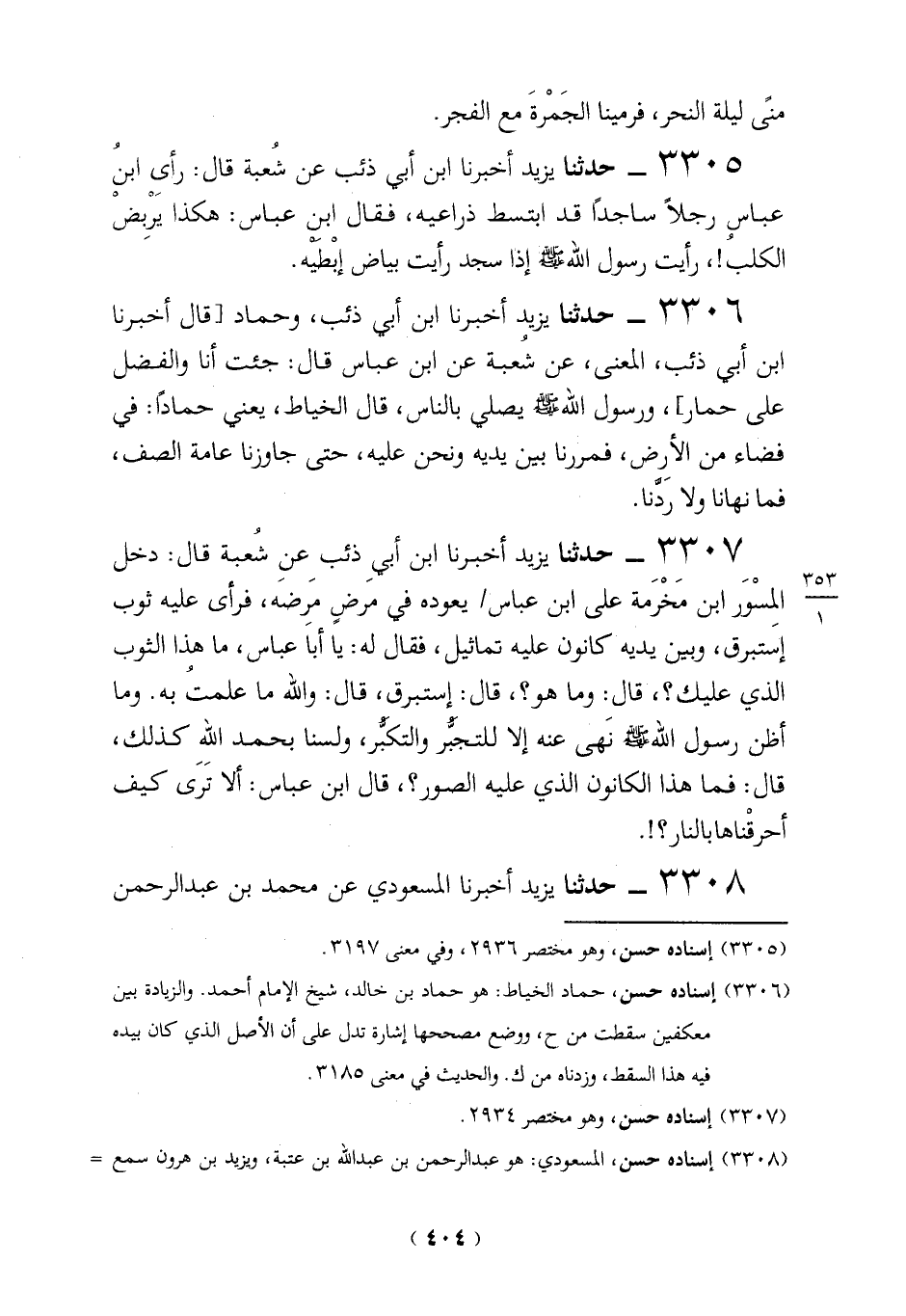 3305 - حدثنا يزيد أخبرنا ابن أبي ذئب عن شُعبة قال؟ رأى ابنُ عباس رجلاً ساجداً قد ابتسط ذراعيه، فقال ابن عباس: هكذا يَربضْ الكلبُ!، رأيت رسول الله - صلى الله عليه وسلم - إذا سجد رأيت بياض إبْطَيْه.