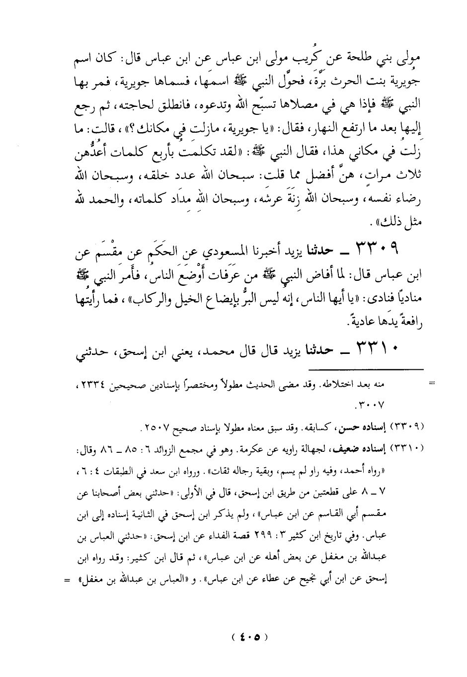 3309 - حدثنا يزيد أخبرنا المسعودي عن الحَكَيم عن مقْسَم عن ابن عباس قال: لما أفاض النبي - صلى الله عليه وسلم - من عَرَفات أَوْضَعَ الناسُ، فأَمرَ النبي - صلى الله عليه وسلم - منادياً فنادى: "يا أيها الناس، إنه ليس البرُّ بإيضاع الخيل والركاب"، فما رأيتُها رافعةً يدَها عاديةً.