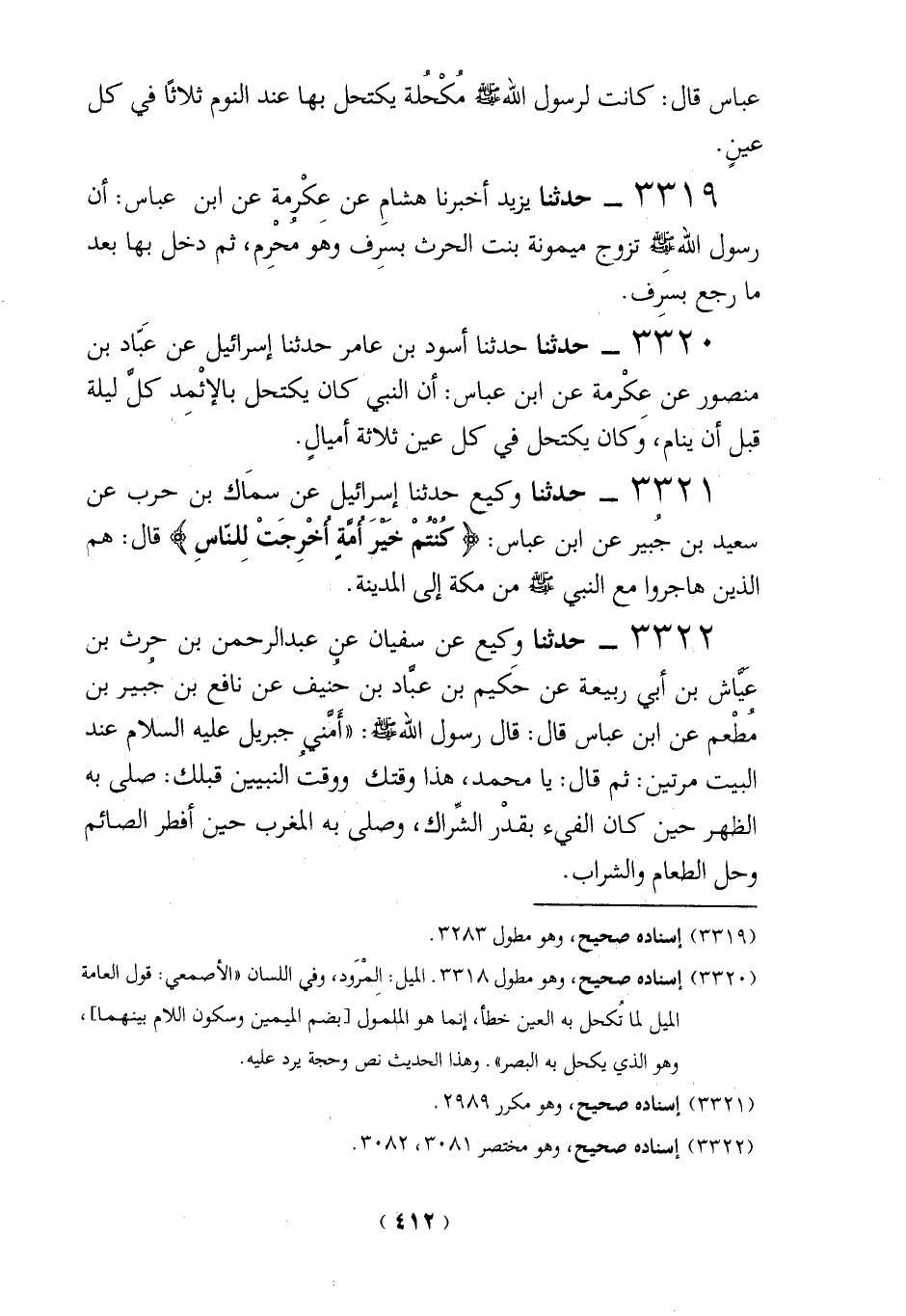 3320 - حدثنا حدثنا أسود بن عامر حدثنا إسرائيل عن عَبّاد بن منصور عن عكْرمة عن ابن عباس: أن النبي كان يكتحل بالإثْمد كلَّ ليلة قبل أن ينام، وَكان يكتحل في كل عين ثلاثة أميالٍ.