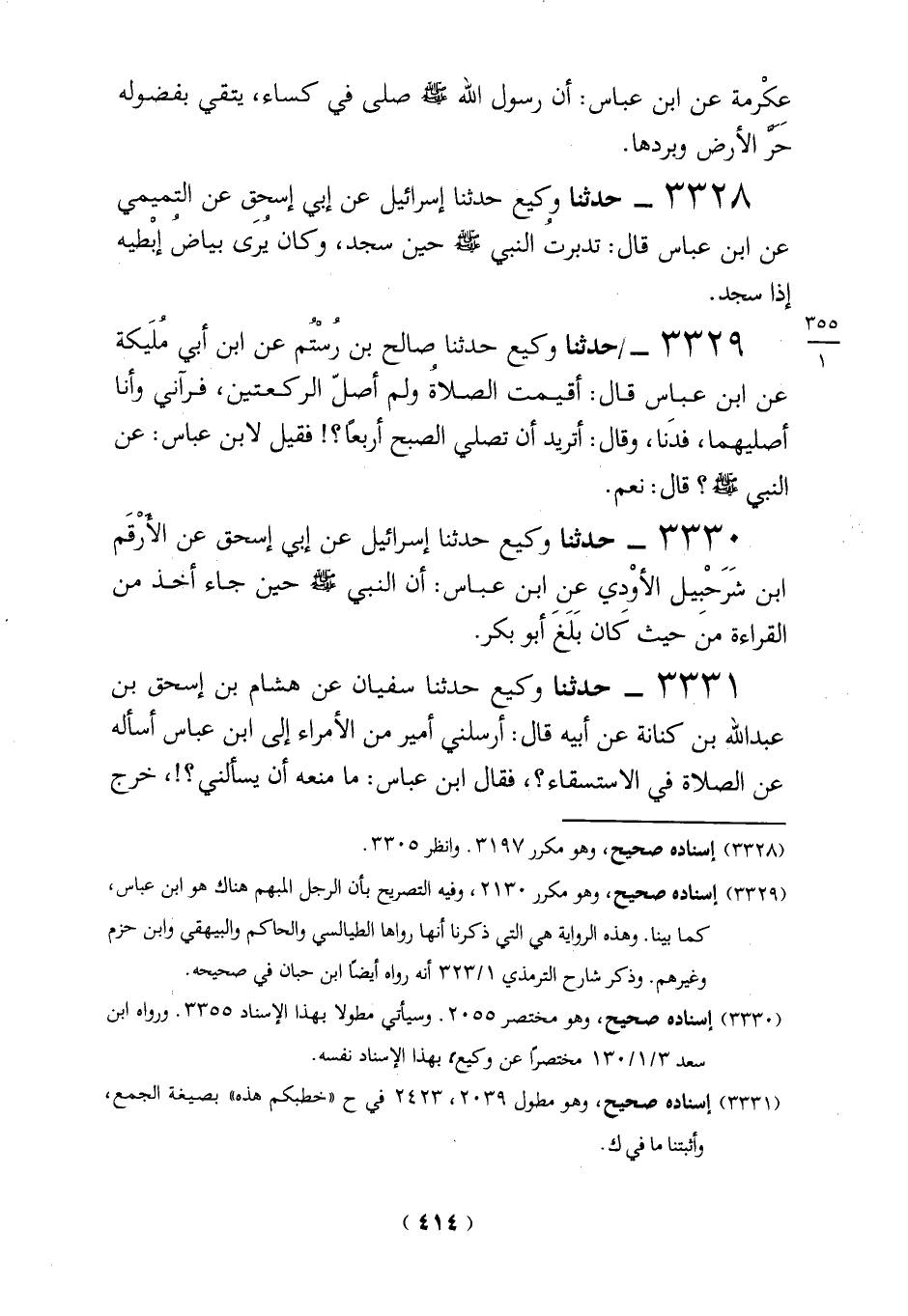 3328 - حدثنا وكيع حدثنا إسرائيل عن إبى إسحِق عن التميمي عن ابن عباس قال: تدبرتُ النبي - صلى الله عليه وسلم - حين سجد، وكان يُرى بياضُ إبْطيه إذا سجد.