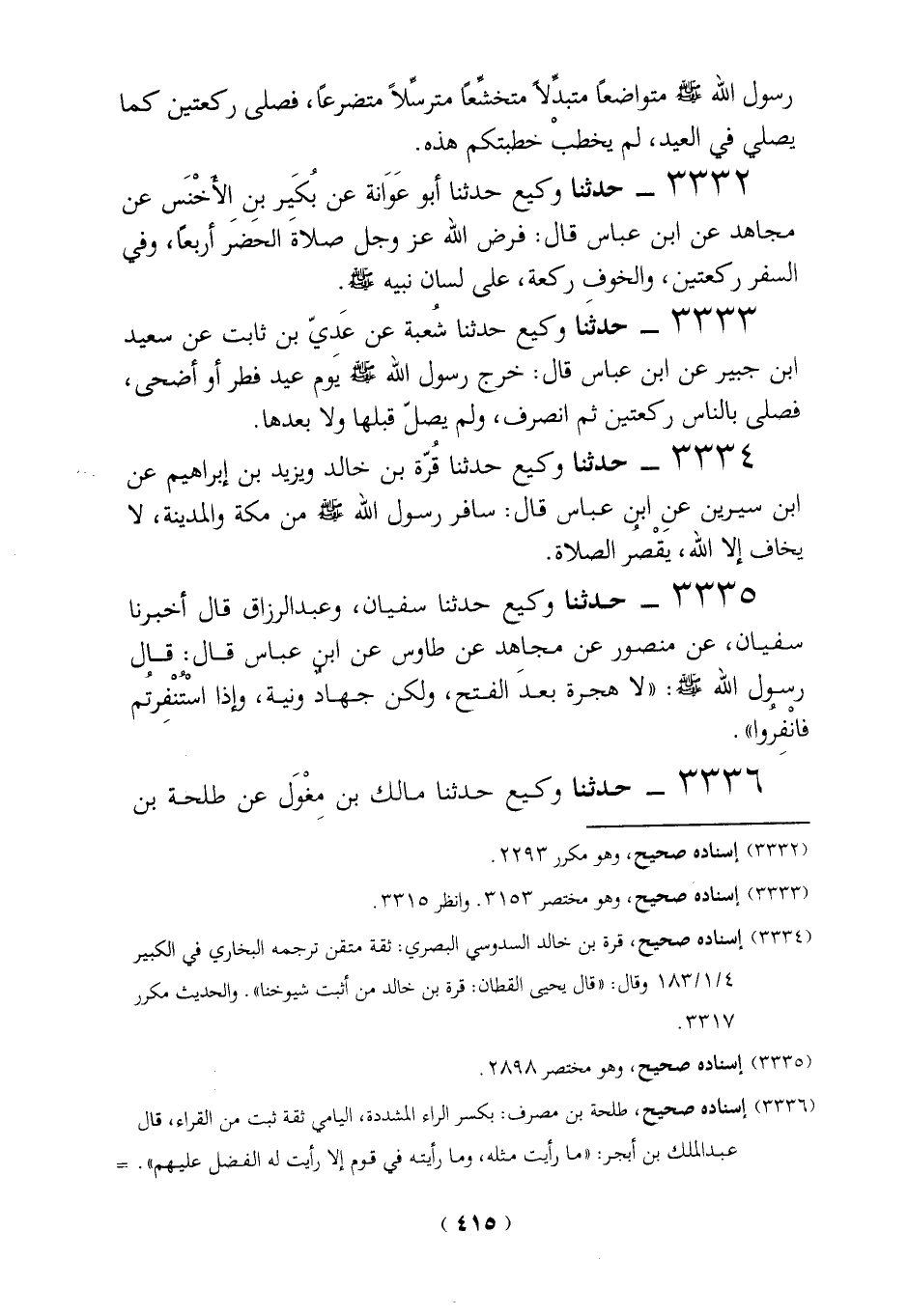 3333 - حدثَنا وكيع حدثنا شُعبة عن عَدِيّ بن ثابت عن سعيد ابن جُبير عن ابن عباس قال: خرج رسول الله - صلى الله عليه وسلم - يَوم عيد فطر أو أضحى، فصلى بالناس ركعتين ثم انصرف، ولم يصلّ قبلها ولا بعدها.