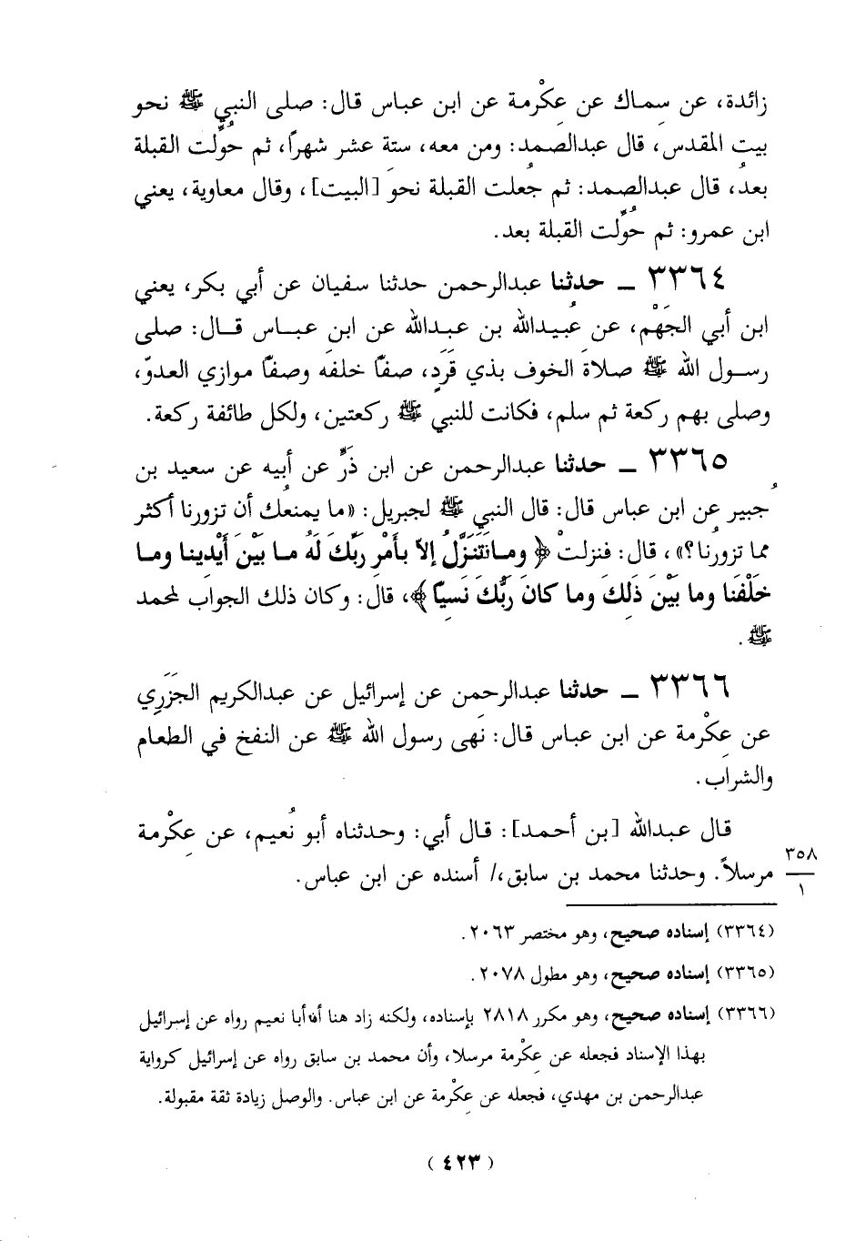(3366) إسناده صحيح، وهو مكرر 2818 بإسناده، ولكنه زاد هنا أن أبا نعيم رواه عن إسرائيل بهذا الإسناد فجعله عن عِكْرمة مرسلاً، وأن محمد بن سابق رواه عن إسرائيل كرواية عبد الرحمن بن مهدي، فجعله عن عِكْرمة عن ابن عباس. والوصل زيادة ثقة مقبولة.