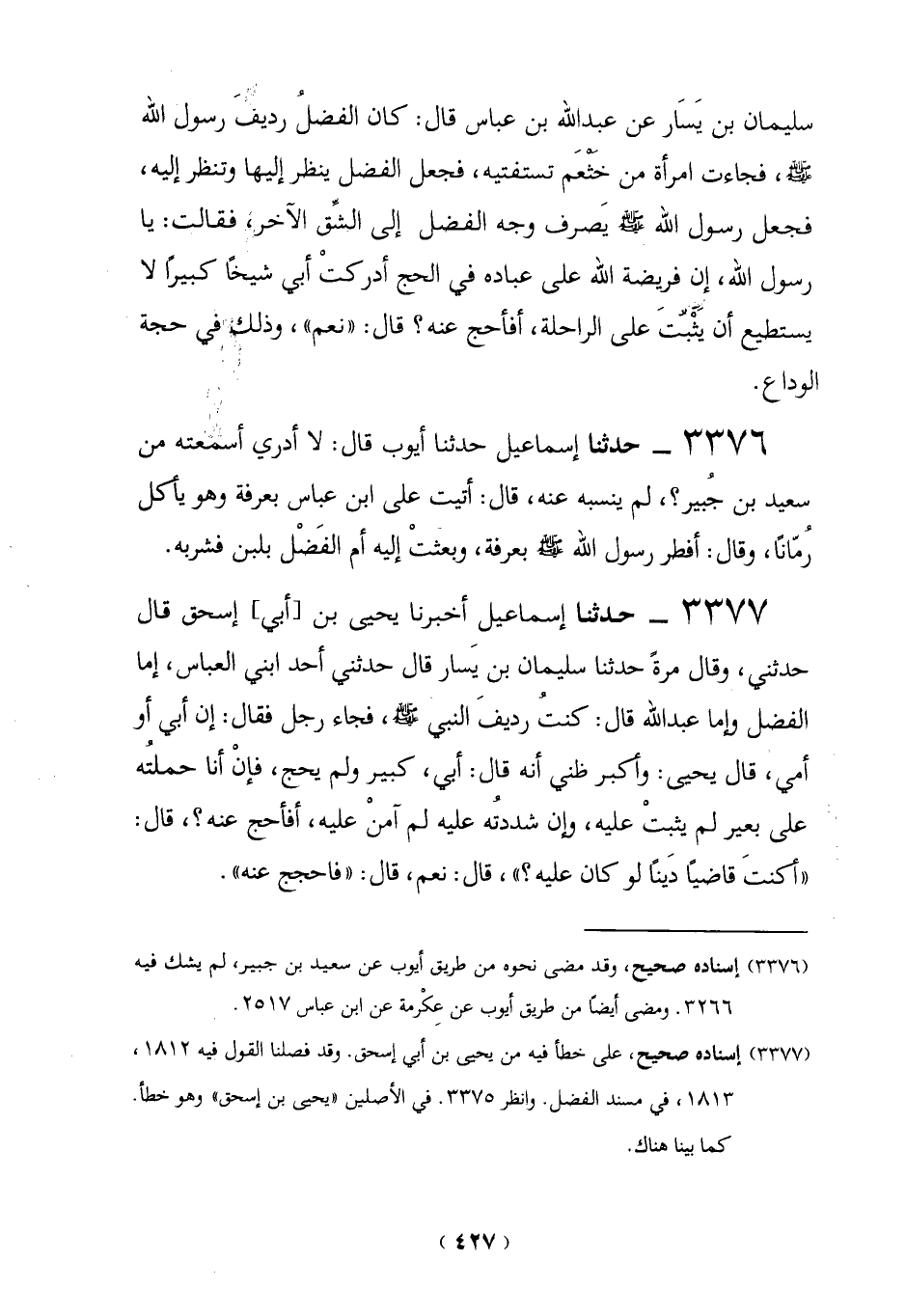 (3377) إسناده صحيح، على خطأ فيه من يحيى بن أبي إسحق. وقد فصلنا القول فيه 1812، 1813، في مسند الفضل. وانظر 3375. في الأصلين "يحيى بن إسحق" وهو خطأ. كما بينا هناك.