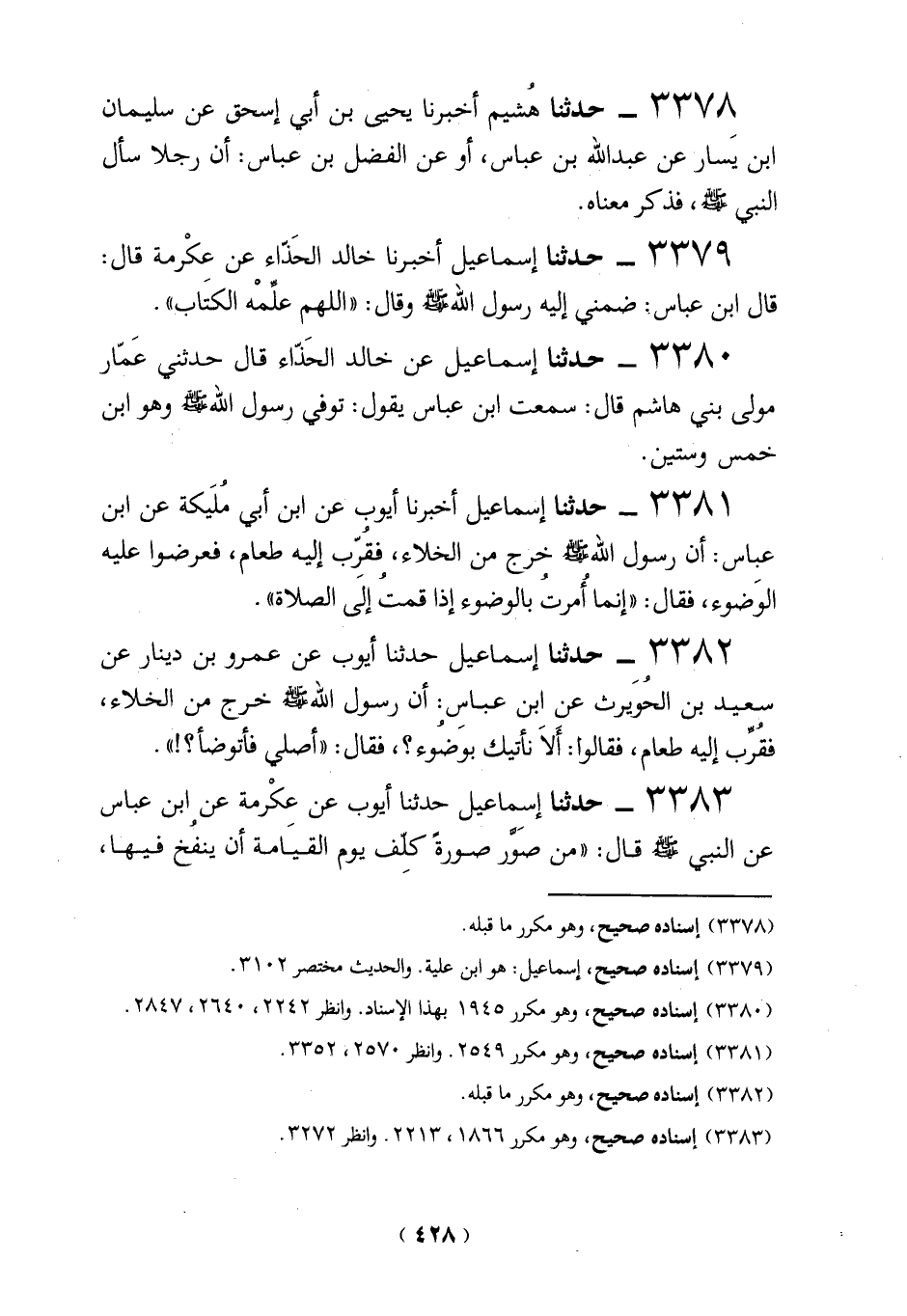 3382 - حدثنا إسماعيل حدثنا أيوب عن عمرو بن دينار عن سعيد بن الحُوَيرث عن ابن عباسِ أن رسول الله - صلى الله عليه وسلم - خرج من الخلاء، فقُرِّب إليه طعام، فقالوا: أَلاَ نأتيك بوضوء؟، فقال: "أصلي فأتوضأ؟! ".