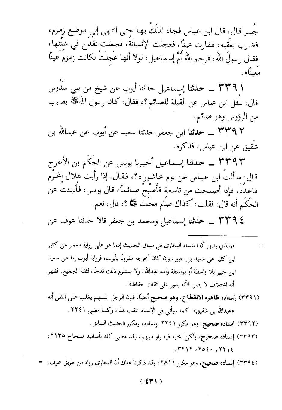 3393 - حدثنا إسماعيل أخبرنا يونس عن الحَكَم بن الأعرج قال: سألتُ ابن عباس عن يوم عاشوراء؟، فقال: إذا رأيت هلال المحرم فاعدُدْ، فإذا أصبحت من تاسعة فأَصْبِحْ صائماً، قال يونس: فأُنبئتُ عن الحَكَم أنه قال: فقلت: أكذاك صام محمد - صلى الله عليه وسلم -؟، قال: نعم.