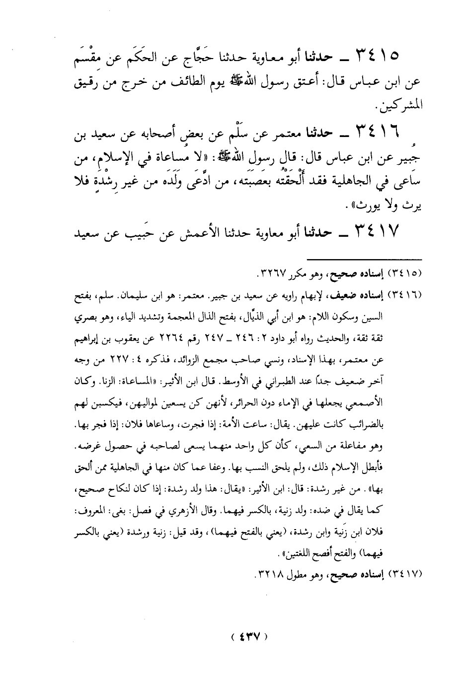 3416 - حدثنا معتمر عن سَلْم عن بعض أصحابه عن سعيد بن جُبير عن ابن عباس قال: قال رسِولٍ الله - صلى الله عليه وسلم -: "لا مُساعاة في الإسلامِ، من سَاعى في الجاهلية فقد أَلْحَقْتُه بعَصبَتَه، من ادَّعَى وَلَدَه من غير رِشْدَة فلا يرث ولايورث".