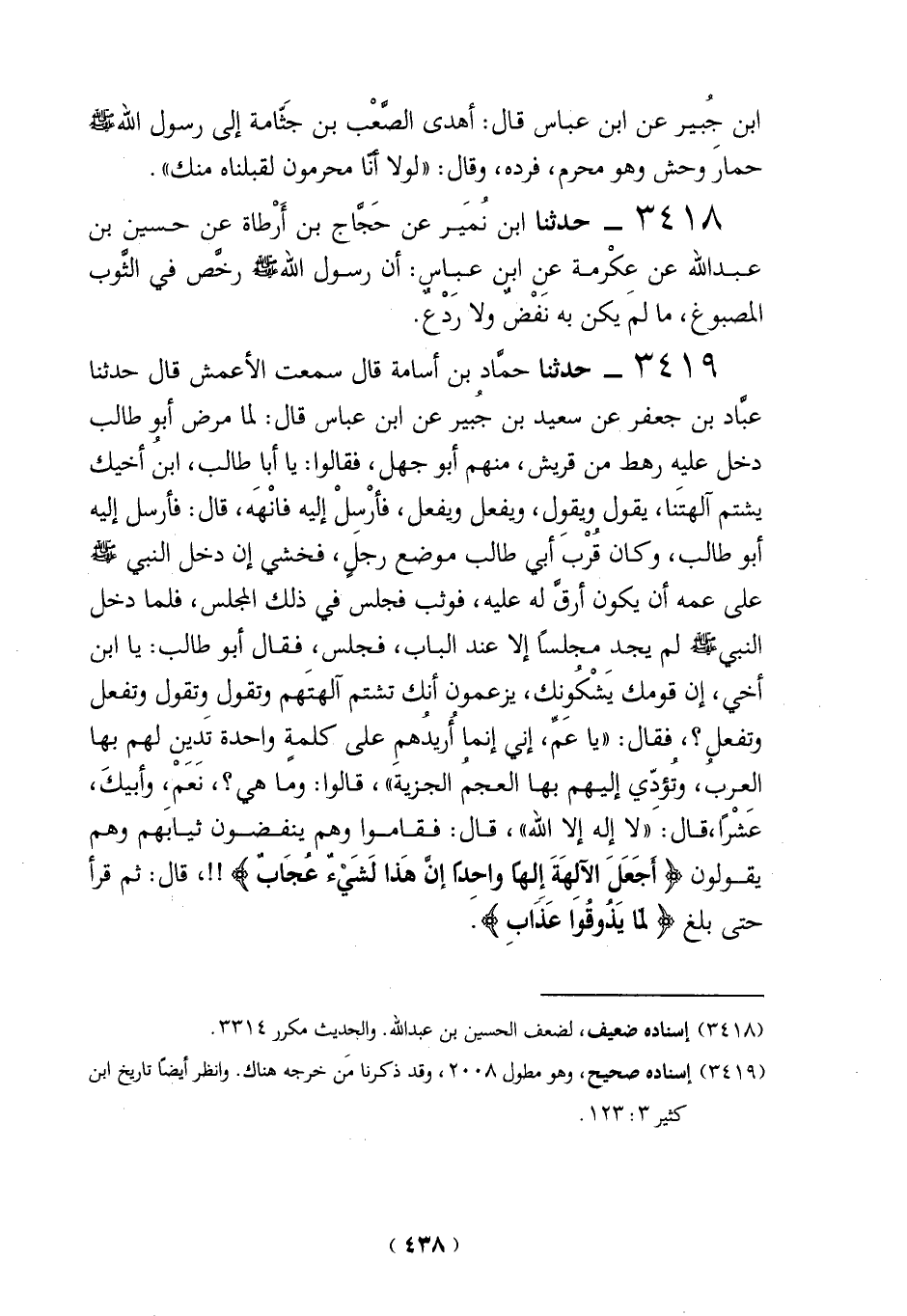 3419 - حدثنا حمَّاد بن أسامة قال سمعت الأعمش قال حدثنا عبَّاد بن جعفر عن سعيد بن جُبير عن ابن عباس قال: لما مرض أبو طالب دخل عليه رهط من قريش، منهم أبو جهل، فقالوا: يا أبا طالب، ابنُ أخيك يشتم آلهتَنا، يقول ويقول، ويفعل ويفعل، فأرْسلْ إليه فانْهَه، قال: فأرسل إليه أبو طالب، وكان قُرْبَ أبي طالب موضع رجلٍ، فخشى إن دخل النبي - صلى الله عليه وسلم - على عمه أن يكون أرقَّ له عليه، فوثب فجلس في ذلك المجلس، فلما دخل النبي - صلى الله عليه وسلم - لم يجد مجلساً إلا عند الباب، فجلس، فقال أبو طالب: يا ابن أخي، إن قومك يَشْكُونك، يزعمون أنك تشتم آلهتَهم وتقول وِتقول وتفعل وتفعل؟، فقال: "يا عَمِّ، إني إنما أُريدُهمِ على كلمة واحدة تدين لهم بها
