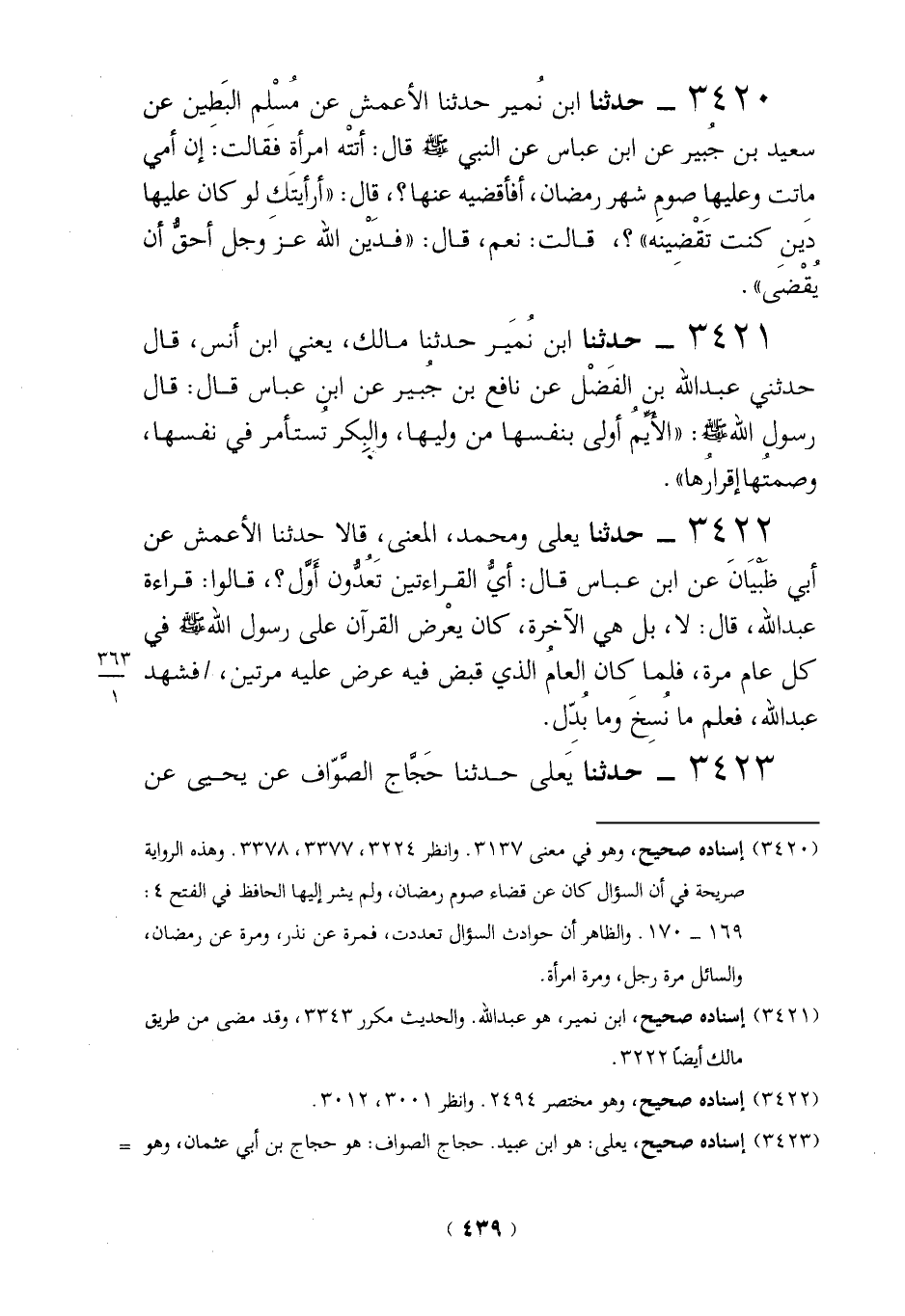 (3421) إسناده صحيح، ابن نمير، هو عبد الله. والحديث مكرر 3343، وقد مضى من طريق مالك أيضاً 3222.