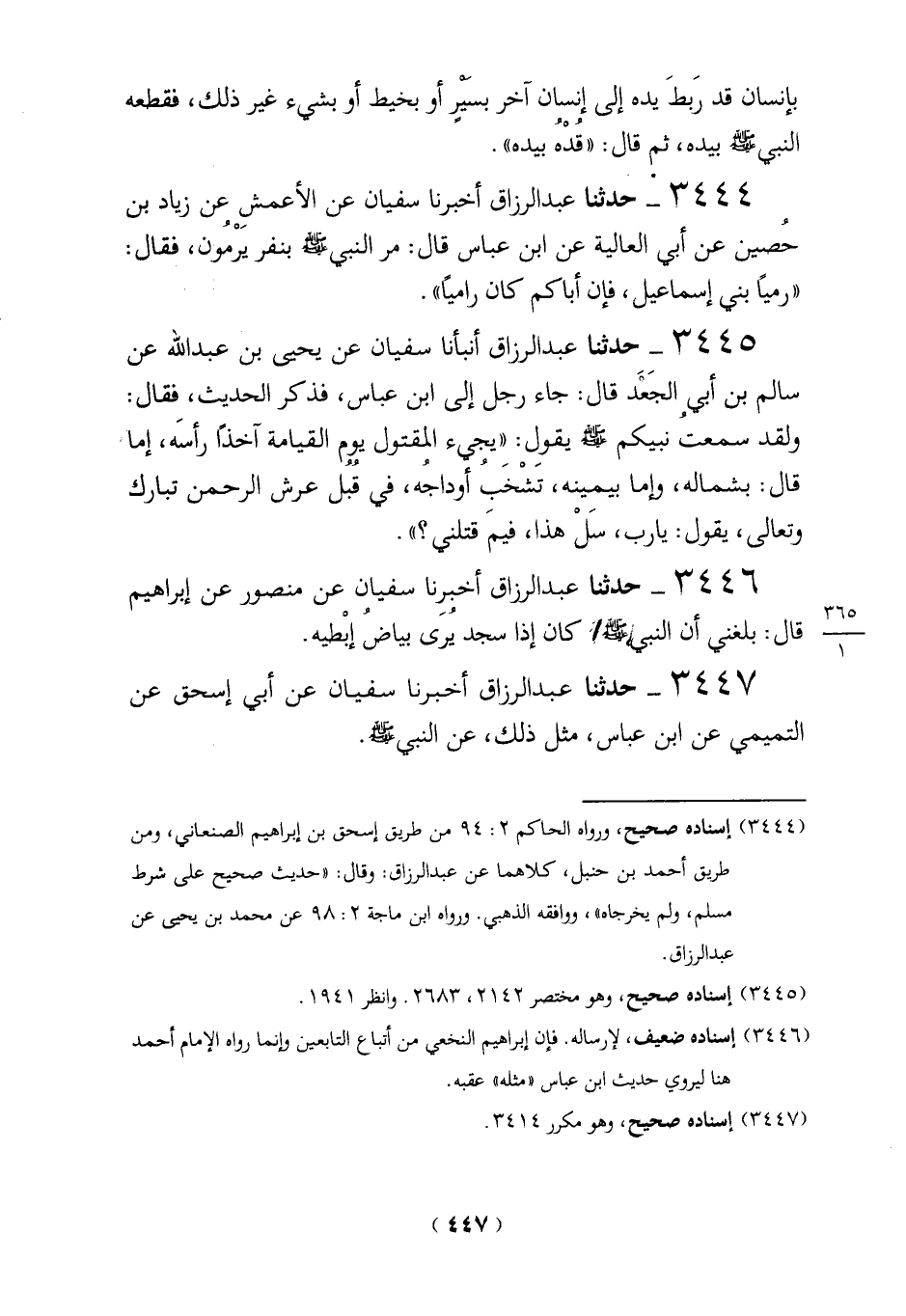 3445 - حدثنا عبد الرزاق أنبأنا سفيان عن يحيى بن عبد الله عن سالم بن أبي الجَعْد قال: جاء رجل إلى ابن عباس، فذكر الحديث، فقال: ولقد سمعتُ نبيكم - صلى الله عليه وسلم - يقول: "يجيء المقتول يوم القيامة آخذا رأسَه، إما قال: بشماله، وإما بيمينه، تَشْخَبُ أوداجُه، في قُبُل عرش الرحمن تبارك وتعالى، يقول: يا رب، سَلْ هذا، فيمَ قتلني؟ ".