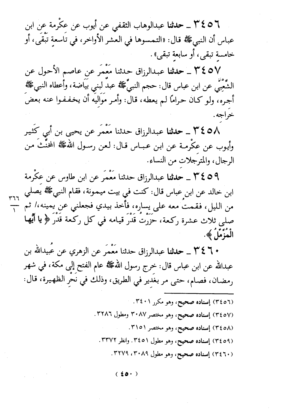 3459 - حدثنا عبد الرزاق حدثنا مَعْمَر عن ابن طاوس عن عكْرمة ابن خالد عن ابن عباس قال: كنت في بيت ميمونة، فقام النبي - صلى الله عليه وسلم - يَصلي من الليل، فقمت معه علي يساره، فأخذ بيدي فجعلني عنِ يمينه، ثم صلى ثلاث عشرة ركعة، حزَرْت قَدْرَ قيامه في كل ركعة قدْرَ {يَا أَيُّهَا الْمُزَّمِّلُ}.
