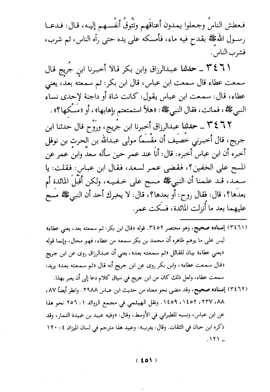 (3461) إسناده صحيح، وهو مختصر 3452. قوله "قال ابن بكر: ثم سمعته بعد، يعني عطاء" ليس على ما يوهم ظاهره أن محمد بن بكر سمعه من عطاء، فهو محال، وإنما قوله "يعني عطاء" بيان للقائل "ثم سمعته بعد"، يعني أن عبد الرزاق روى عن ابن جُريج "قال سمعت عطاء"، وابن بكر روى عن ابن جُريج أنه قال "ثم سمعته بعد" يريد: سمعت عطاء، ولعل ذلك كان من ابن جُريج في سياق كلام دعا إلى أن يعبر بهذا.