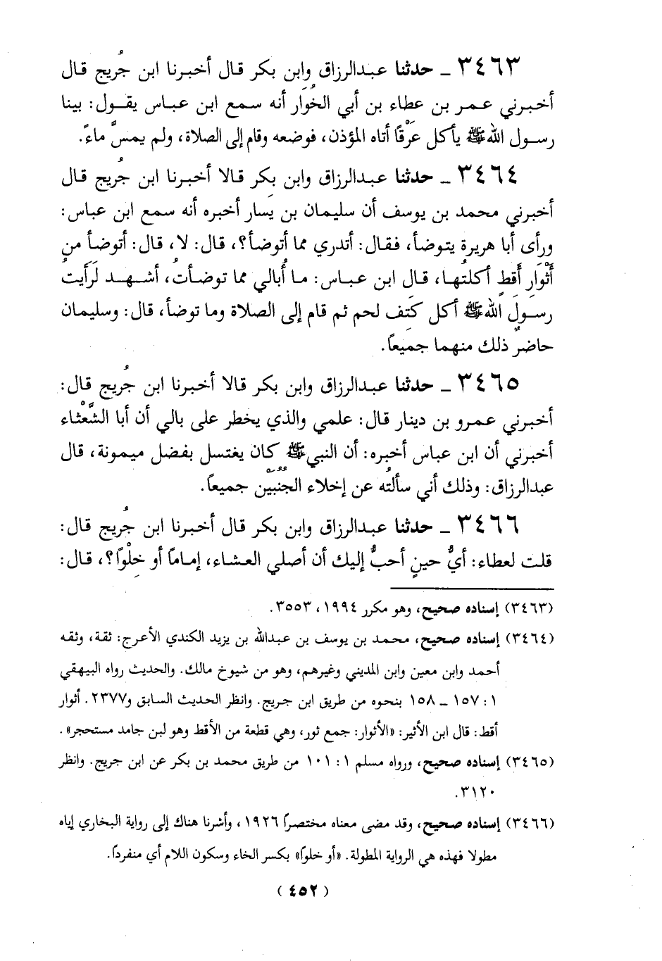 3464 - حدثنا عبد الرزاق وابن بكر قالا أخبرنا ابن جُريج قال أخبرني محمد بن يوسف أن سليمان بن يَسار أخبره أنه سمع ابن عباس: ورأى أبا هريرة يتوضأ، فقال: أتدري مما أتوضأ؟، قال: لا، قال: أتوضأ من أثوَارِ أقط أكلتُها، قال ابن عباس: ما أبالي مما توضأت، أشهد لَرَأيتُ رسولَ الله أكل أكل كَتف لحم ثم قام إلى الصلاة وما توضأ، قال: وسليمان حاضرٌ ذلك منهما جمَيعاً.