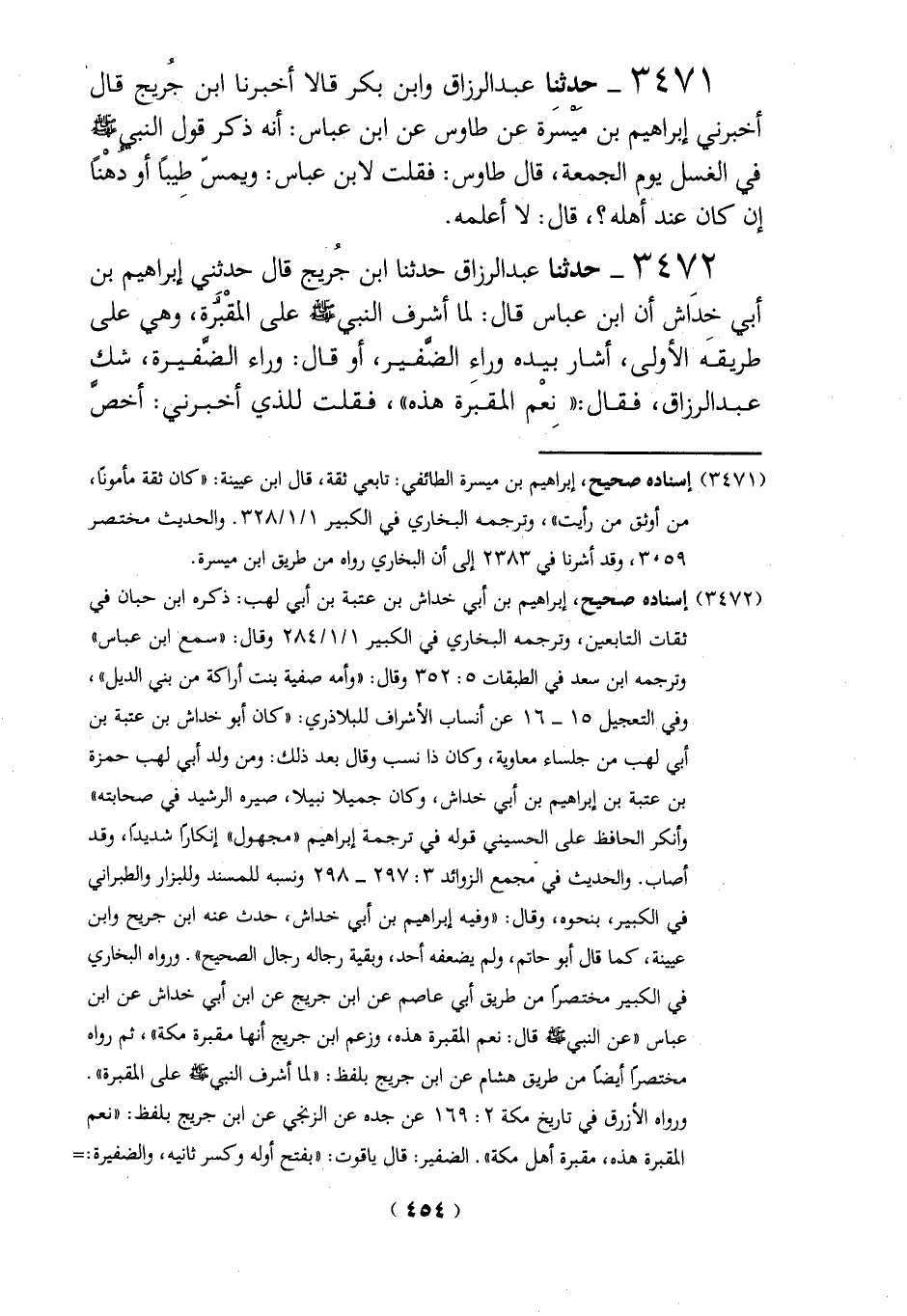 3472 - حدثنا عبد الرزاق حدثنا ابن جُريج قال حدثني إبراهيم بن أبي خدَاش أن ابن عباس قال: لما أسْرف النبي-صلي الله عليه وسلم- على المقْبَرة، وهي على طريقَه الأولى، أشار بيده وراء الضفير، أو قال: وراء الضفيرة، شك عبد الرزاق، فقال: "نِعْم المقبَرة هذه"، فقلت للذي أخبرني: أخصَّ