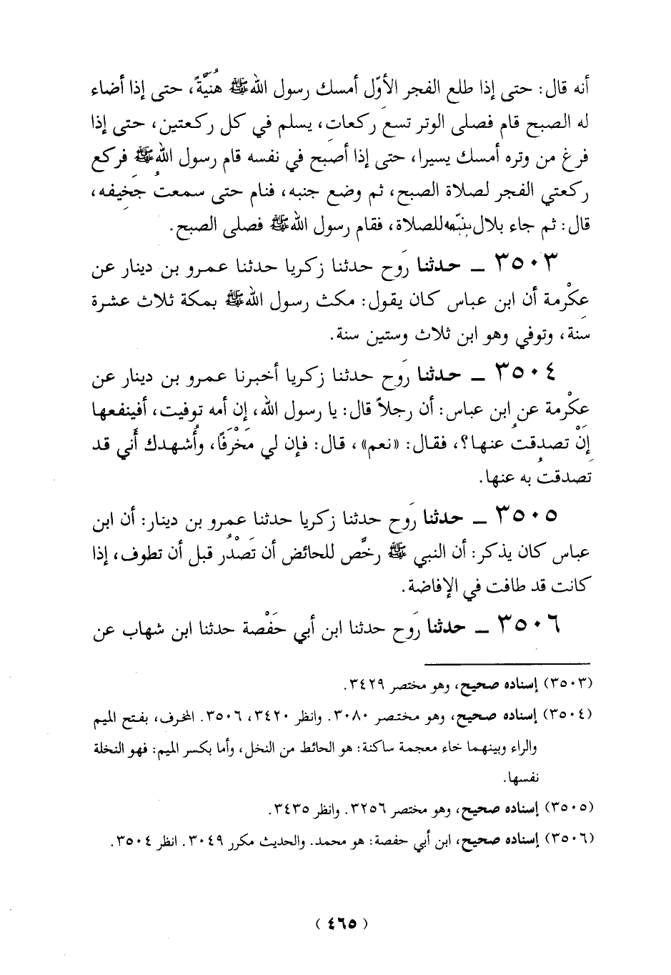 3503 - حدثنا رَوح حدثنا زكريا حدثنا عمرو بن دينار عن عِكْرمة أن ابن عباس كان يقول: مكث رسول الله - صلى الله عليه وسلم - بمكة ثلاث عشرة سنة، وتوفى وهو ابن ثلاث وستين سنة.