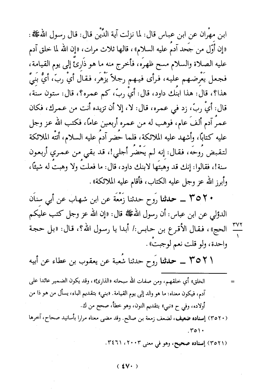 ابن مهْران عن ابن عباس قال: لما نزلت آية الدَّيْن قال: قال رسول الله - صلى الله عليه وسلم -: "إن أَوّل من جَحد آدم عليه السلام"، قالها ثلاث مرات، "إن الله لما خلق آدم عليه الصلاة والسلام مسح ظهرَه، فأخرج منه ما هو ذَارِئٌ إلى يوم القيامة، فجعل- يَعْرِضهم عليه، فرأى فيهم رجلاً يَزْهَر، فقال أيْ ربّ، أيُّ بَنِيَّ هذا؟، قال: هذا ابنك داود، قال: أي ربّ، كم عمره؟، قال: ستون سنة،