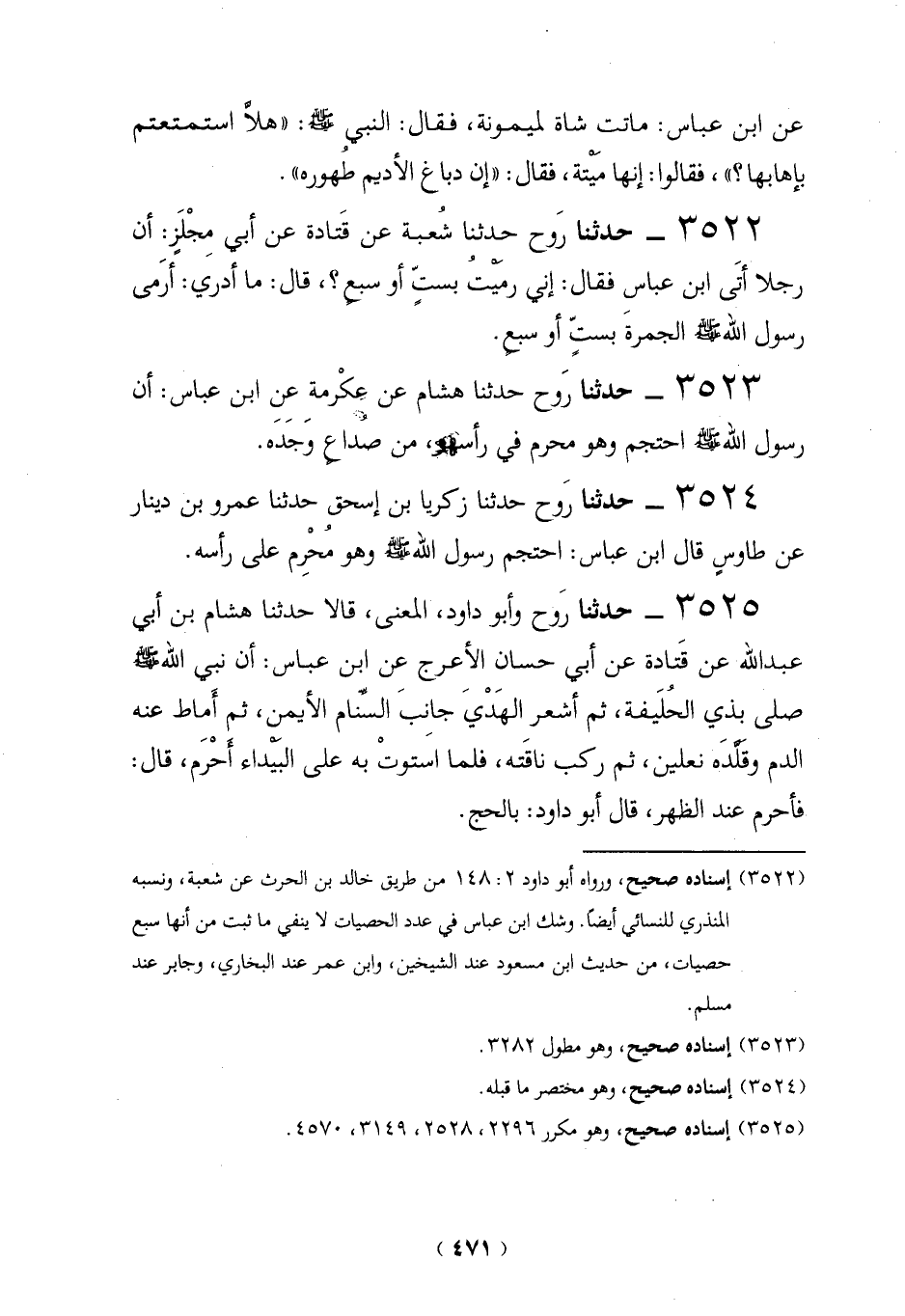 3524 - حدثنا رَوح حدثنا زكريا بن إسحق حدثنا عمرو بن دينار عن طاوسٍ قال ابن عباس: احتجم رسول الله -صلي الله عليه وسلم- وهو مُحْرِم على رأسه.