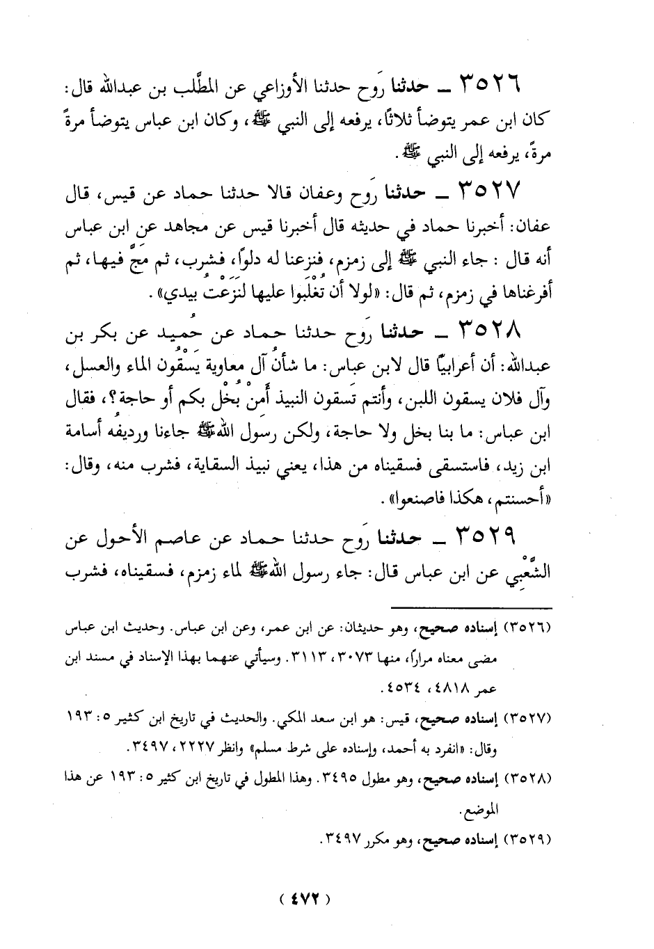 3529 - حدثنا رَوح حدثنا حماد عن عاصم الأحول عن الشَّعْبِي عن ابن عباس قال: جاء رسول الله - صلى الله عليه وسلم - لماء زمزم، فسقيناه، فشرب