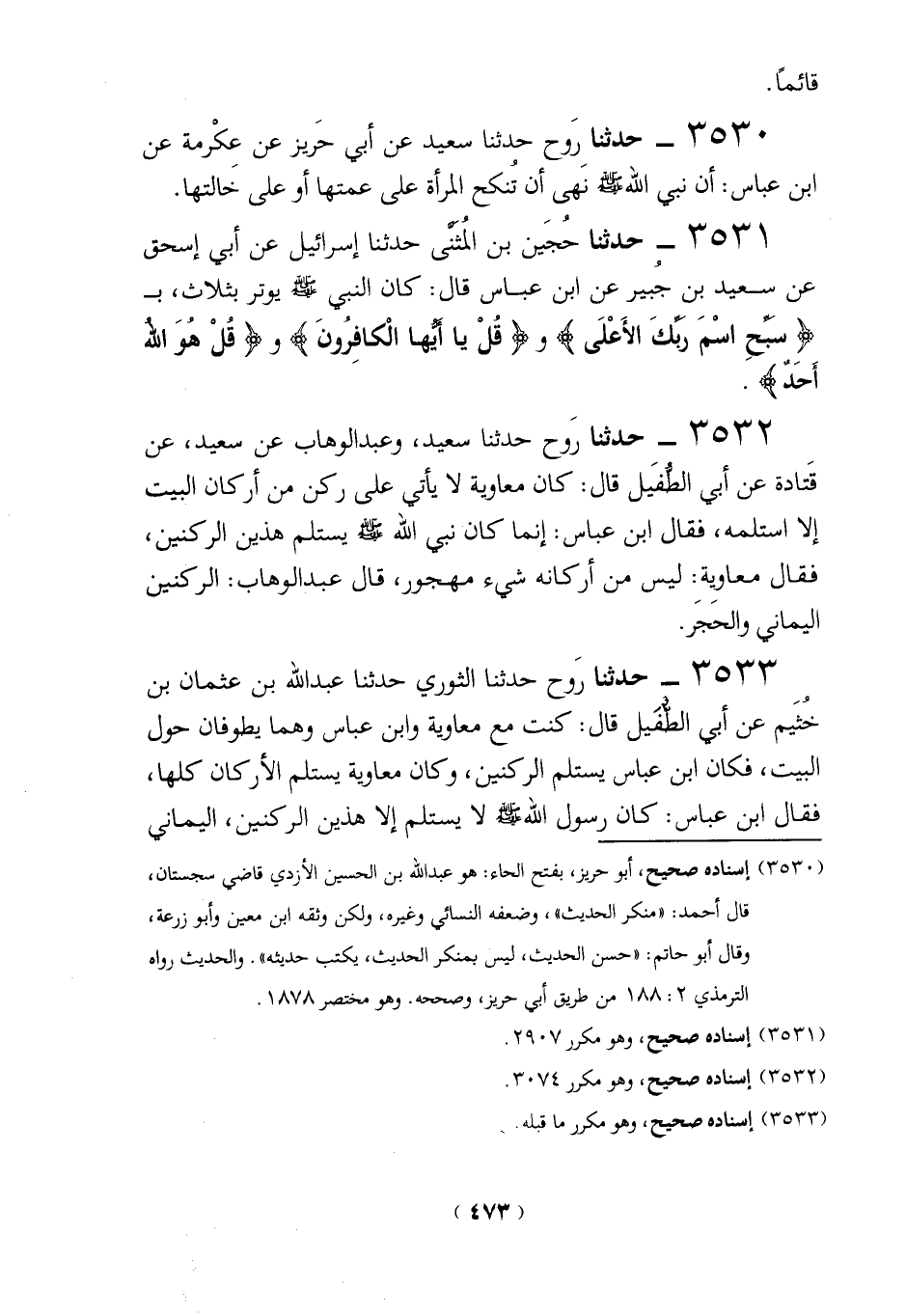 3533 - حدثنا رَوح حدثنا الثوري حدثنا عبد الله بن عثمان بن خُثَيم عن أبي الطَّفَيل قال: كنت مع معاوية وابن عباس وهما يطوفان حول البيت، فكان ابن عباس يستلم الركنين، وكان معاوية يستلم الأركان كلها، فقال ابن عباس: كان رسول الله-صلي الله عليه وسلم- لا يستلم إلا هذين الركنين، اليماني