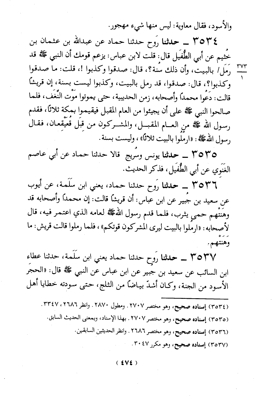 3537 - حدثنا رَوح حدثنا حماد يعني ابن سَلَمة، حدثنا عطاء ابن السائب عن سعيد بن جُبير عن ابن عباس عن النبي - صلى الله عليه وسلم - قال: "الحجَر الأسود من الجنة، وكان أشدّ بياضاً من الثلج، حتى سودته خطايا أهل