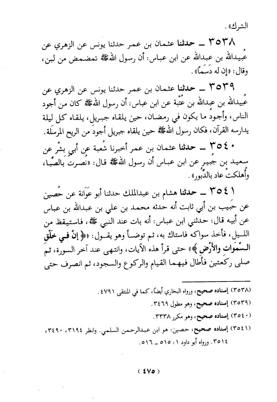 3539 - حدثنا عثمان بن عمر حدثنا يونس عن الزهري عن عُبيد الله بن عبد الله بن عُتْبة عن ابن عباس: أن رسول الله -صلي الله عليه وسلم- كان من أجود الناس، وأجودُ ما يكون في رمضان، حين يلقاه جبريلِ، يلقاه كل ليلة يدارسه القرآن، فكان رسول الله - صلى الله عليه وسلم - حين يلقاه جبريل أجودَ من الريح المرسَلة.