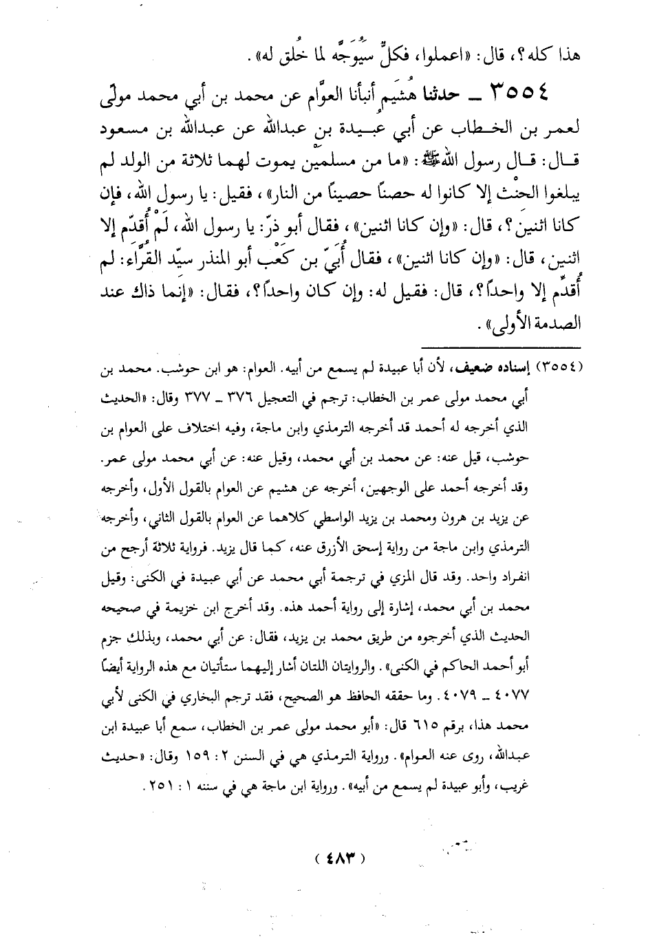 3554 - حدثنا هُشَيم أنبأنا العوَّام عن محمد بن أبي محمد مولىً لعمر بن الخطاب عن أبي عُبيدة بن عبد الله عن عبد الله بن مسعود قال: قال رسول الله-صلي الله عليه وسلم-: "ما من مسلمين يموت لهما ثلاثة من الولد لم يبلغوا الحنْث إلا كانوا له حصناً حصيناً من النار"، فقيل: يا رسول الله، فإن كانا اثنينَ؟، قال: "وإن كانا اثنين"، فقال أبو ذرّ: يا رسول الله، لَمْ أُقدّم إلا اثنين، قال: "وإن كانا اثنين"، فقال أُبَىّ بن كَعْب أبو المنذر سيّد القُرَّاءَ: لم أُقدِّم إلا واحداً؟، قال: فقيل له: وإن كان واحداً؟، فقال: "إنَما ذاك عند الصدمة الأولى".
