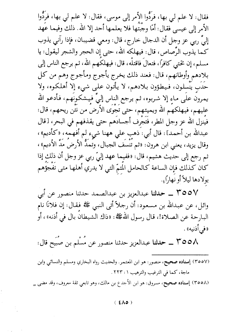 3557 - حدثنا عبد العزيز بن عبد الصمد حدثنا منصور عن أبي وائل، عن عبد الله بن مسعود: أن رجلاً أتى النبي - صلى الله عليه وسلم - فقال: إن فلاناً نام البارحة عن الصلاة!، قال رسول الله - صلى الله عليه وسلم -: "ذاك الشيطانُ بال في أذنه"، أو "في أذنيه".