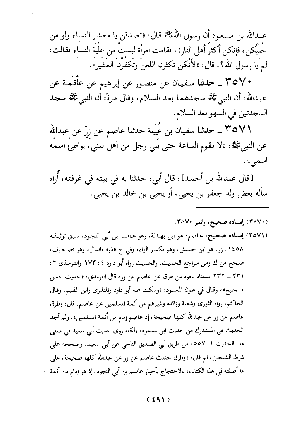 (3571) إسناده صحيح، عاصم: هو ابن بهدلة، وهو عاصم بن أبي النجود، سبق توثيقه 1458. زر: هو ابن حبيش، وهو بكسر الزاء، وفي ح "ذر" بالذال، وهو تصحيف، صح من ك ومن مراجع الحديث. والحديث رواه أبو داود 4: 173 والترمذي 3: 231 - 232 بمعناه نحوه من طرق عن عاصم عن زر، قال الترمذي: "حديث حسن صحيحاً، وقال في عون المعبود: "وسكت عنه أبو داود والمنذري وابن القيم. وقال الحاكم: رواه الثوري وشعبة وزائدة وغيرهم من أئمة المسلمين عن عاصم. قال: وطرق عاصم عن زر عن عبد الله كلها صحيحة، إذ عاصم إمام من أئمة المسلمين!. ولم أجد الحديث في المستدرك من حديث ابن مسعود، ولكنه روى حديث أبي سعيد في معنى هذا الحديث 4: 557، من طريق أبي الصديق الناجي عن أبي سعيد، وصححه على شرط الشيخين، ثم قال: "وطرق حديث عاصم عن زر عن عبد الله كلها صحيحة، على ما أصلته في هذا الكتاب، بالاحتجاج بأخبار عاصم بن أبي النجود، إذ هو إمام من أئمة =