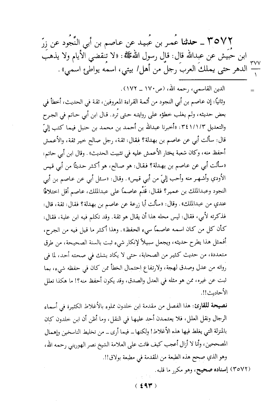 وثانياً: إن عاصم بن أبي النجود من أئمة القراءة المعروفين، ثقة في الحديث، أخطأ في بعض حديثه، ولم يغلب خطؤه على روايته حتى تُرد. قال ابن أبي حاتم في الجرح والتعديل 3/ 1/ 341: "أخبرنا عبد الله بن أحمد بن محمد بن حنبل فيما كتب إليّ قال: سألت أبي عن عاصم بن بهدلة؟ فقال: ثقة، رجل صالح خير ثقة، والأعمش أحفظ منه، وكان شُعبة يختار الأعمش عليه في تثبيت الحديث". وقال ابن أبي حاتم: "سألت أبي عن عاصم بن بهدلة؟ فقال: هو صالح، هو أكثر حديثاً من أبي قيس الأودي وأشهر منه وأحب إليّ من أبي قيس". وقال: "سئل أبي عن عاصم بن أبي النجود وعبد الملك بن عمير؟ فقال: قَدِّم عاصما ًعلى عبد الملك، عاصم أقال اختلافاً عندي من عبد الملك". وقال: "سألت أبا زرعة عن عاصم بن بهدلة؟ فقال: ثقة، قال: فذكرته لأبي، فقال: ليس محله هذا أن يقال هو ثقة. وقد تكلم فيه ابن علية، فقال: كأن كل من كان اسمه عاصماً سيء الحفظ". وهذا أكتر ما قيل فيه من الجرح، أفمثل هذا يطرح حديثه، ويجعل سبيلاً لإنكار شيء ثبت بالسنة الصحيحة، من طرق متعددة، من حديث كثير من الصحابة، حتى لا يكاد يشك في صحته أحد، لما في رواته من عدل وصدق لهجة، ولارتفاع احتمال الخطأ ممن كان في حفظه شيء، بما ثبت عن غيره، ممن هو مثله في العدل والصدق، وقد يكون أحفظ منه؟! ما هكذا تعلل الأحاديث!!.
