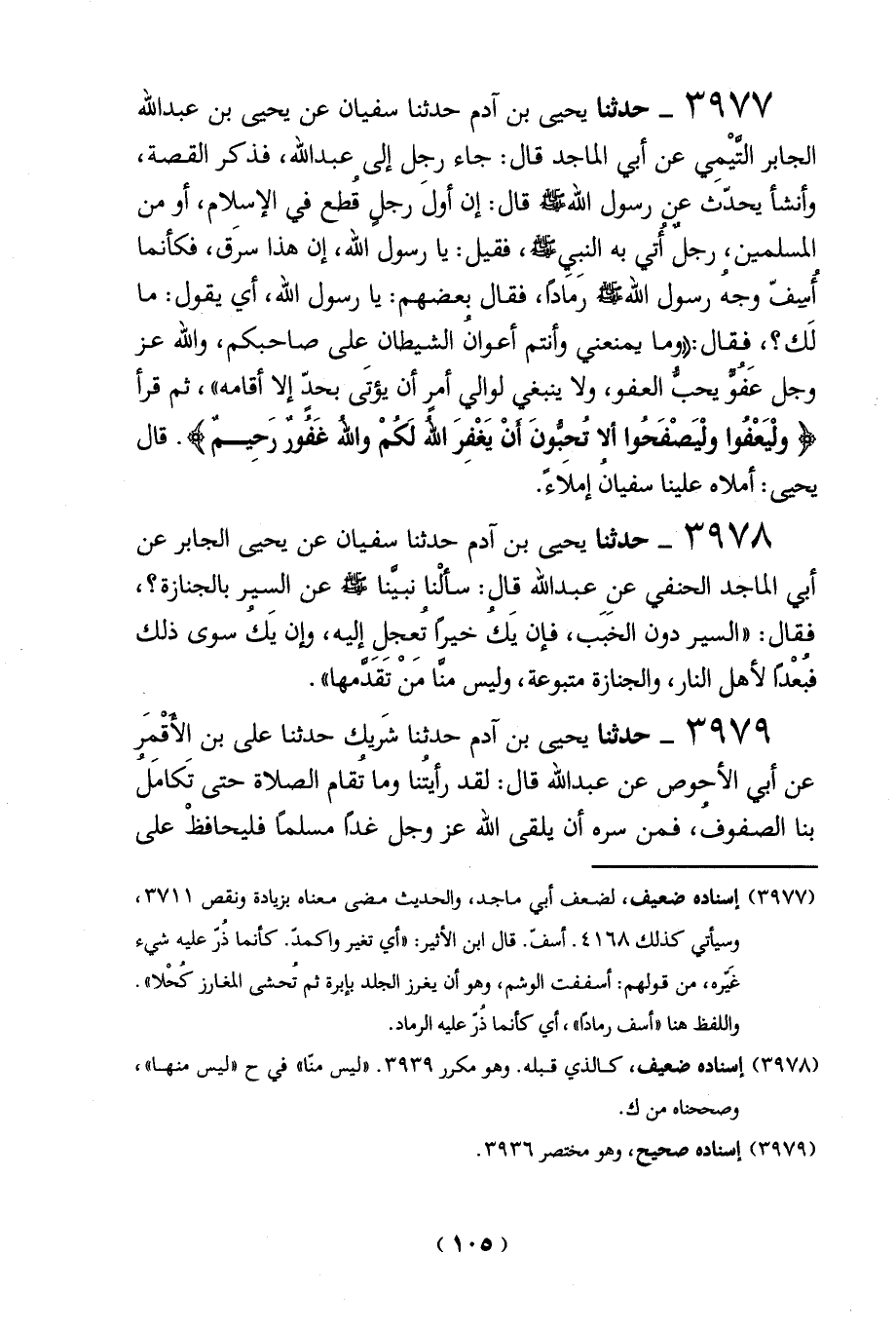3977 - حدثنا يحيى بن آدم حدثنا سفيان عن يحيى بن عبد الله الجابر التَّيْمِي عن أبي الماجد قال: جاء رجل إلى عبد الله، فذكر القصة، وأنشأ يحدّث عين رسول الله - صلى الله عليه وسلم - قال: إن أولَ رجل قُطع في الإسلام، أو من المسلمين رجلٌ أُتي به النبي - صلى الله عليه وسلم -، فقيل: يا رسول الله، إن هذا سرَق، فكأنما أُسِفّ وجهُ رسول الله - صلى الله عليه وسلم - رَماد، فقال بعضهم: يا رسول الله، أي يقول: ما لَك؟، يقال: "وما يمنعني وأنتم أعوانُ الشيطان على صاحبكم، والله عز وجل عَفُوُّ يحبُّ العفو، ولا ينبغي لوالي أمرٍ أن يؤتَى بحدّ إلا أقامه"، ثم قرأ {وَلْيَعْفُوا وَلْيَصْفَحُوا أَلَا تُحِبُّونَ أَنْ يَغْفِرَ اللَّهُ لَكُمْ وَاللَّهُ غَفُورٌ رَحِيمٌ (22)}. قال يحيى: أملاه علينا سفيانُ إملاَءً.