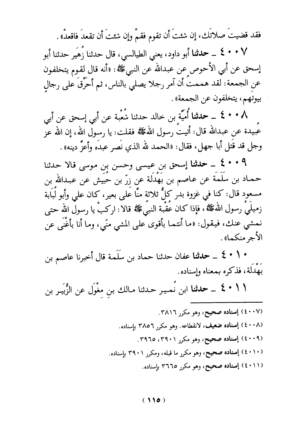 4009 - حدثنا إسحق بنِ عيسى وحسن بنِ موسى قالا حدثنا حماد بن سَلَمَة عن عاصم بن بهْدَلة عن زِرّ بن حُبَيش عن عبد الله بن مسعود قال: كنا في غزوة بدركلُّ ثلاثة منا على بعير، كان على وأبو لُبَابة زميلَي رسول الله - صلى الله عليه وسلم -، فإذا كان عُقْبة النبيَّ - صلى الله عليه وسلم - قالا: اركبْ يا رسول الله حتى نمشي عنك، فيقول: "ما أنتما بأقوى على المشي منَّي، وما أنا بأغْنَى عن الأجر منكما".